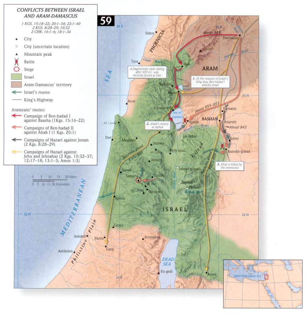 샬마네세르 3세(BC 859-824)의 Kurkh 모놀리스에 아합이 언급되었다 / 벤하닷 2세의 침공로(주황색)
