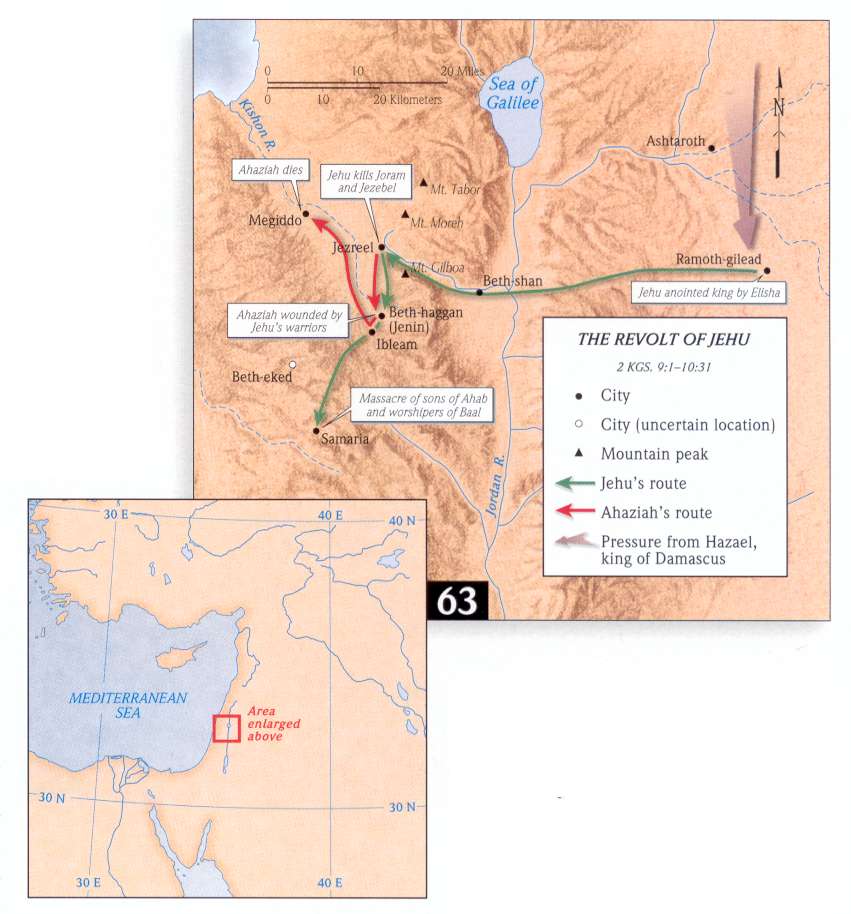 선택한 무리와 함께 예후는 여호람 왕에 대한 음모를 계획하고 몰래 이스르엘에 들어갔다. 여호람 왕은 도망치려 했지만 예후는 그의 심장을 관통하는 화살을 쏘았다. 예후는 나중에 여호람의 아버지와 어머니가 살해한 나봇의 복수를 위해 그의 시체를 나봇의 포도원에 던졌다(왕하 9:26). 아하시야 왕은 여호람의 죽음을 보고 달아났지만 예후는 그에게 상처를 입혔으며 아하시야는 므깃도로 도망쳐 그곳에서 죽었다.
