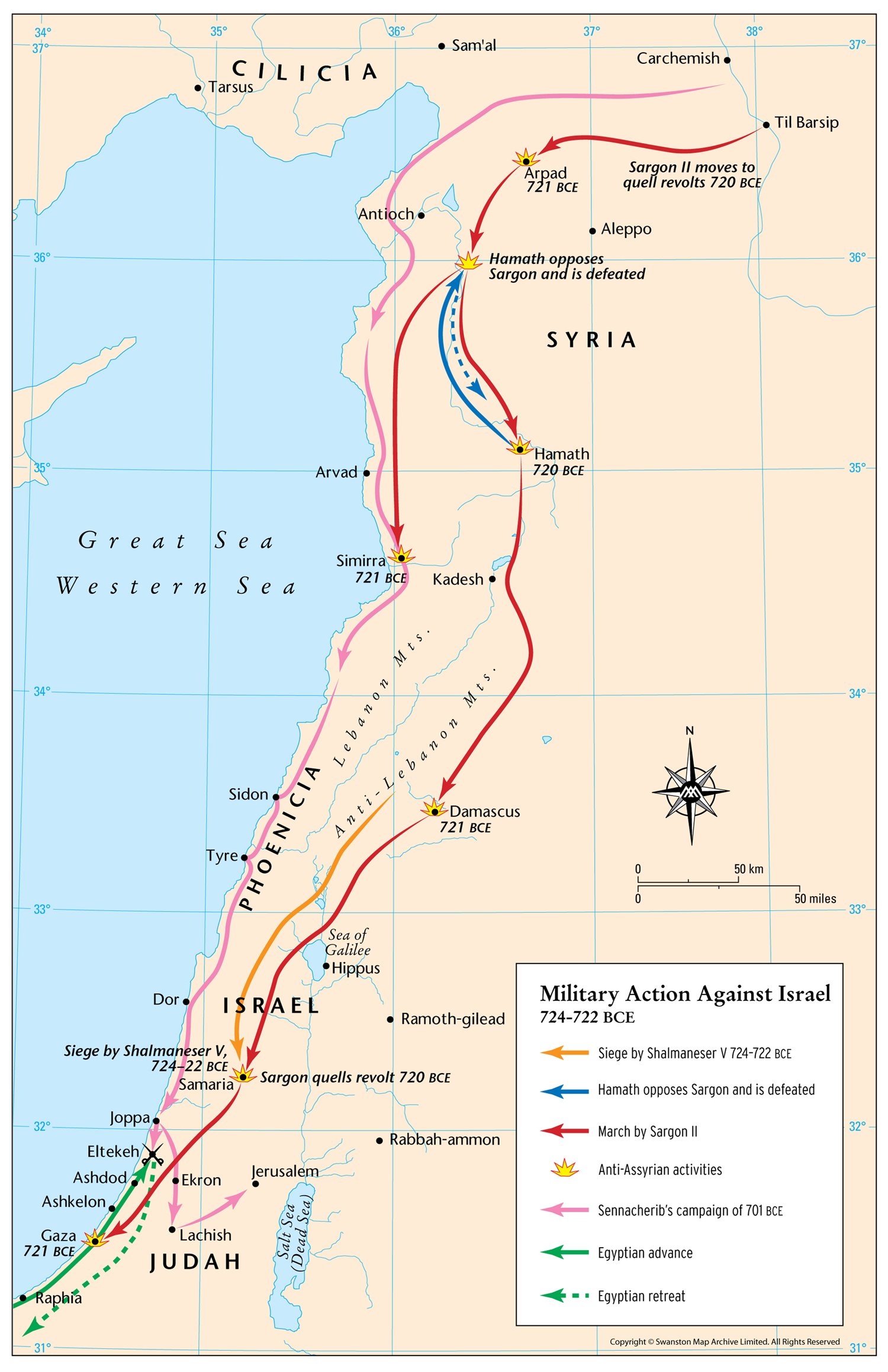샬마네세르는 곧 이것을 반란으로 해석하고 그의 군대를 사마리아로 향하도록 지시했다. 아시리아의 기록 문헌에서 BC 727년, 726년, 725년에 샬마네세르가 "대항세력"(어딘가에 이름 누락)에 대한 캠페인을 벌였음을 보여주며 누락된 이름은 사마리아인 것으로 추정된다. 바빌로니아 연대기에는 샬마네세르가 샤마라인(사마리아) 도시를 파괴했다고 되어있다. 고고학자 타드모르는 사르곤 2세가 통치 후반에 자신이 정복했다고 기록했지만 처음에 사마리아를 점령한 것은 그가 아니라 샬마네세르라는 추가 증거를 제시했으며, 그는 사르곤이 즉위한 후 첫 2년간(BC 722-721) 서쪽에서 캠페인이 없었음을 보여주었다.