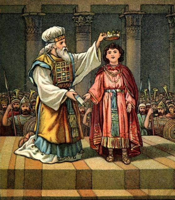 히브리 성경에 따르면 그의 아버지 아하시야가 사망한 후 요아스는 대제사장 여호야다와 결혼한 요아스의 고모 여호세바에 의해 아하시야의 어머니 아달랴의 광란으로부터 구해졌다(왕하 11:2, 대하 22:11). 여호야다는 그를 성전에 6년 동안 숨긴 후 다윗의 왕좌를 빼앗은 아달랴를 상대로 쿠데타를 일으켜 요아스를 왕위에 올렸다. 아달랴는 쿠데타로 사망했다(왕하 11:4, 대하 23:3, 왕하 11:12, 대하 23:11).