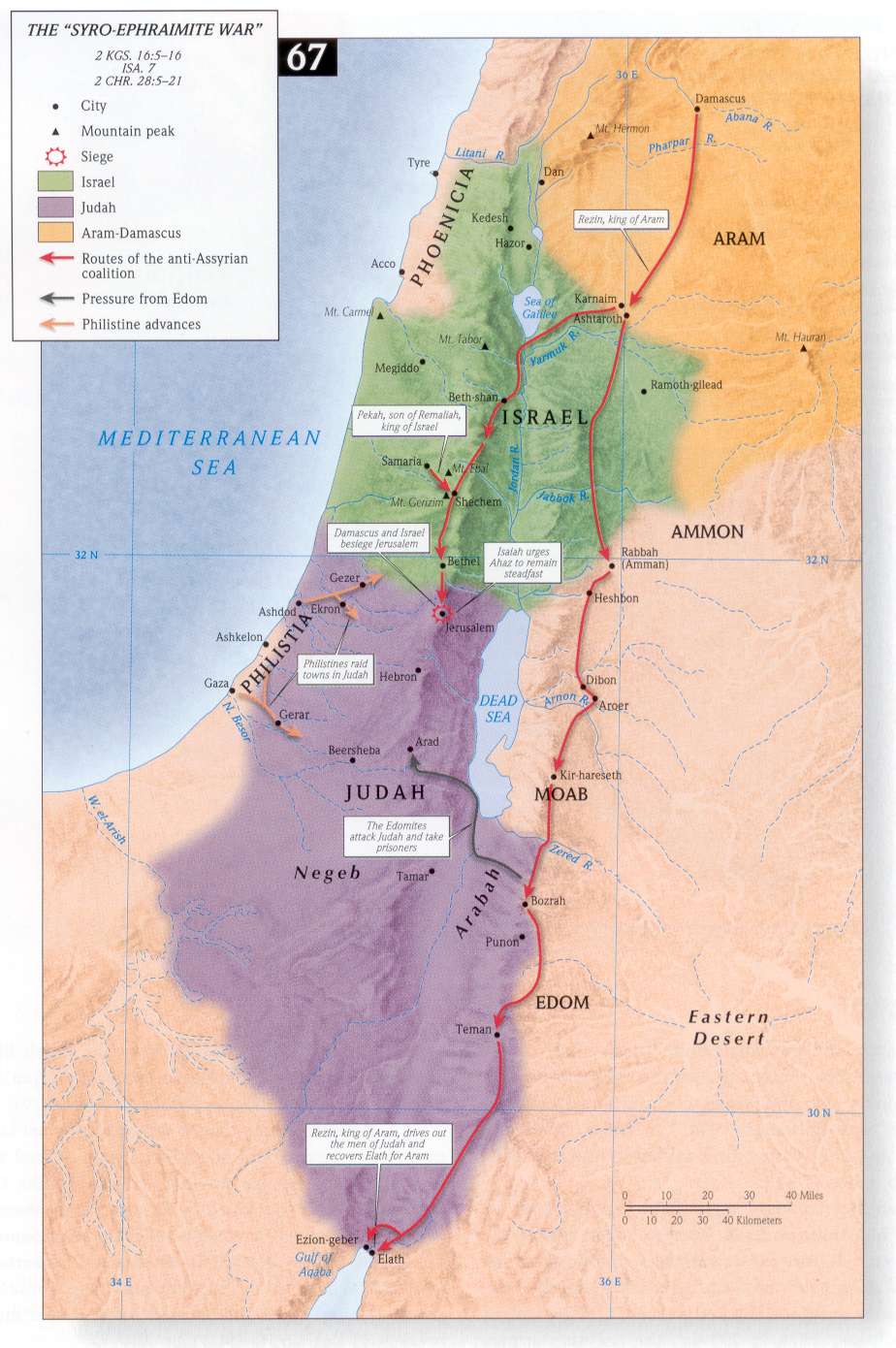 아시리아의 개입과 다마스쿠스 왕국과 이스라엘 왕국을 침략하고 복종시킨 결과, 아하스는 골칫거리인 이웃들로부터 해방되었다. 그러나 아시리아는 이후 유다 왕국에 대해 종주권을 주장하고 가지게 되었다. 이 침략 전쟁은 2년(BC 734-732) 동안 지속되었으며 아시리아가 이스르엘 북쪽의 이스라엘 영토와 다마스쿠스를 점령하고 합병하면서 끝났다. 한편 아하스는 티글라트 필레세르에게 보조 군을 제공했다. 아시리아에 대한 이 호소는 아하스에게 외부의 도움이 아니라 하나님께 의지하라고 권고한 선지자 이사야의 엄격한 반대에 부딪혔다. 아하스는 그의 통치 기간 동안 때때로 앗수르에 대해 반란을 일으킨 이웃 통치자들이 괴롭힘을 당하는 문제로부터 벗어났다. 그리하여 722년에 사마리아가 점령되고 북이스라엘이 아시리아 제국에 완전히 편입되었다.