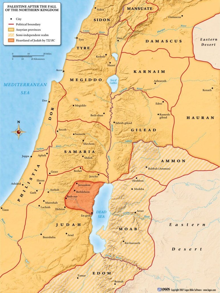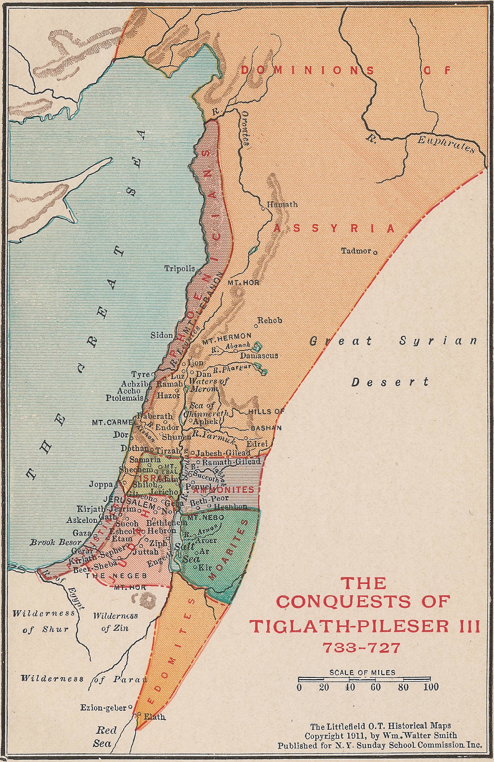 왕국을 보호하기 위해 아하스는 아시리아 사람들의 도움을 요청했다. 티글라트 필레세르는 다마스쿠스를 약탈하고 아람을 합병했다. 왕하 16:9에 따르면 아람 백성은 추방당하고 르신은 처형당했다. 티글라트 필레세르는 이스라엘을 공격하여 "이욘, 아벨벳마아가, 야노아, 게데스, 하솔을 점령했다. 그는 납달리의 온 땅을 포함하여 길르앗과 갈릴리를 점령하고 백성을 아시리아로 추방했다." 티글라트 필레세르는 또한 그의 비문 중 하나에 이 행위를 기록했다.