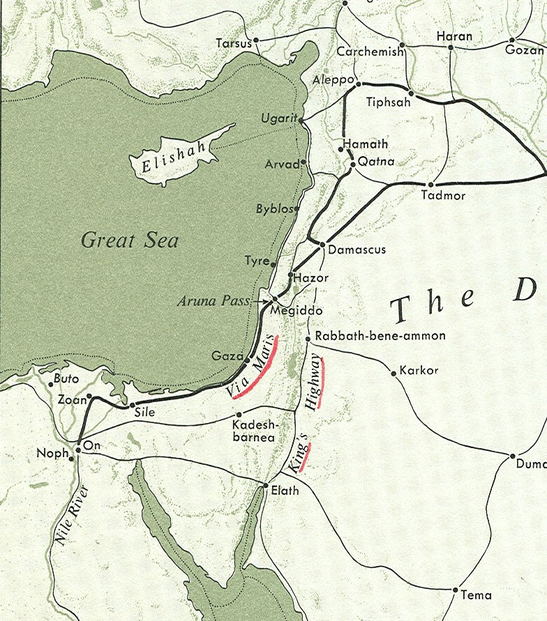 비아 마리스: 팔레스타인 해안을 따라 달리는 청동기 시대 초기부터 사용된 고대 무역로, 라틴어로 "바다의 길"을 의미한다. 그것은 이집트에서 시리아(비옥한 초승달)까지 이스르엘 평야와 요르단 계곡으로 건너기 전에 해안 평야를 따라가는 가장 중요한 경로였다.