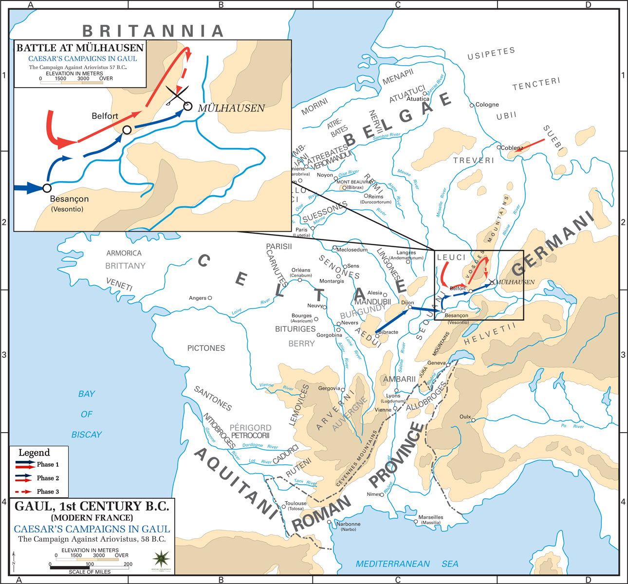 아리오비스투스가 가장 큰 세콰니 마을인 베손티오(오늘날 브장송)를 점령하려 한다는 것을 알게 된 카이사르는 그곳을 향해 그의 군대를 진군하기 시작했다. 그의 장교 중 일부는 정치적 이유로 직책을 맡았으며 전쟁 경험이 없었다. 결과적으로 그들의 사기가 좋지 않아 카이사르의 캠페인을 위협했다. 그는 장교들과 그들의 군단에게 자신이 믿을 수 있는 유일한 군단은 10군단이라고 말하며 시험했다. 자부심을 가지고 10군단은 선두에 섰고 다른 군단들은 뒤지지 않기 위해 결연히 뒤를 따랐다. 결과적으로 카이사르는 아리오비스투스보다 먼저 베손티오에 도착했다.