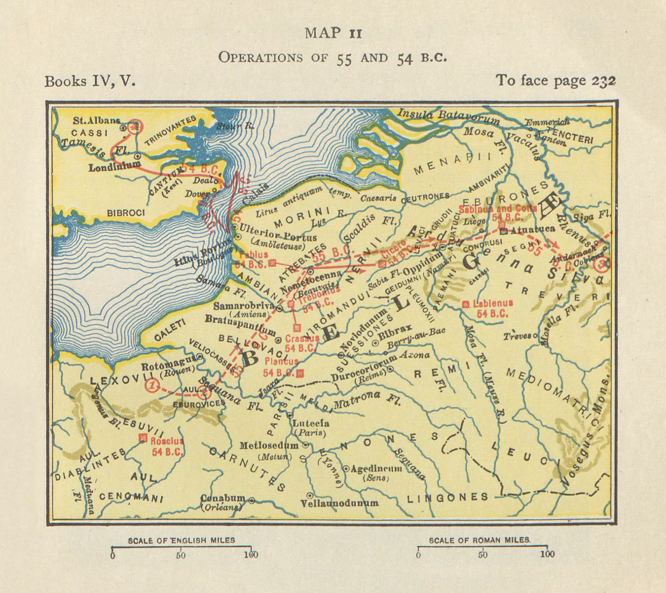 BC 54년 브리타니아에 대한 카이사르의 접근은 훨씬 더 포괄적이고 성공적이었다. 겨울 동안 새로운 배가 건조되었으며 카이사르는 이제 5개의 군단과 2천의 기병을 데려갔다. 그는 질서를 유지하기 위해 갈리아에 나머지 군대를 남겼다. 길리버는 카이사르가 그가 신뢰할 수 없다고 생각한 많은 갈리아 족장들을 데려간 것에 주목했는데 이는 그가 갈리아를 완전히 정복하지 못했다는 또 다른 신호였다. 연말에 일어난 연속된 반란이 이에 대한 더 많은 증거를 제공했다.