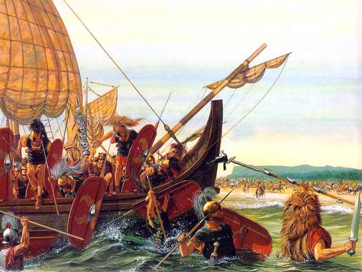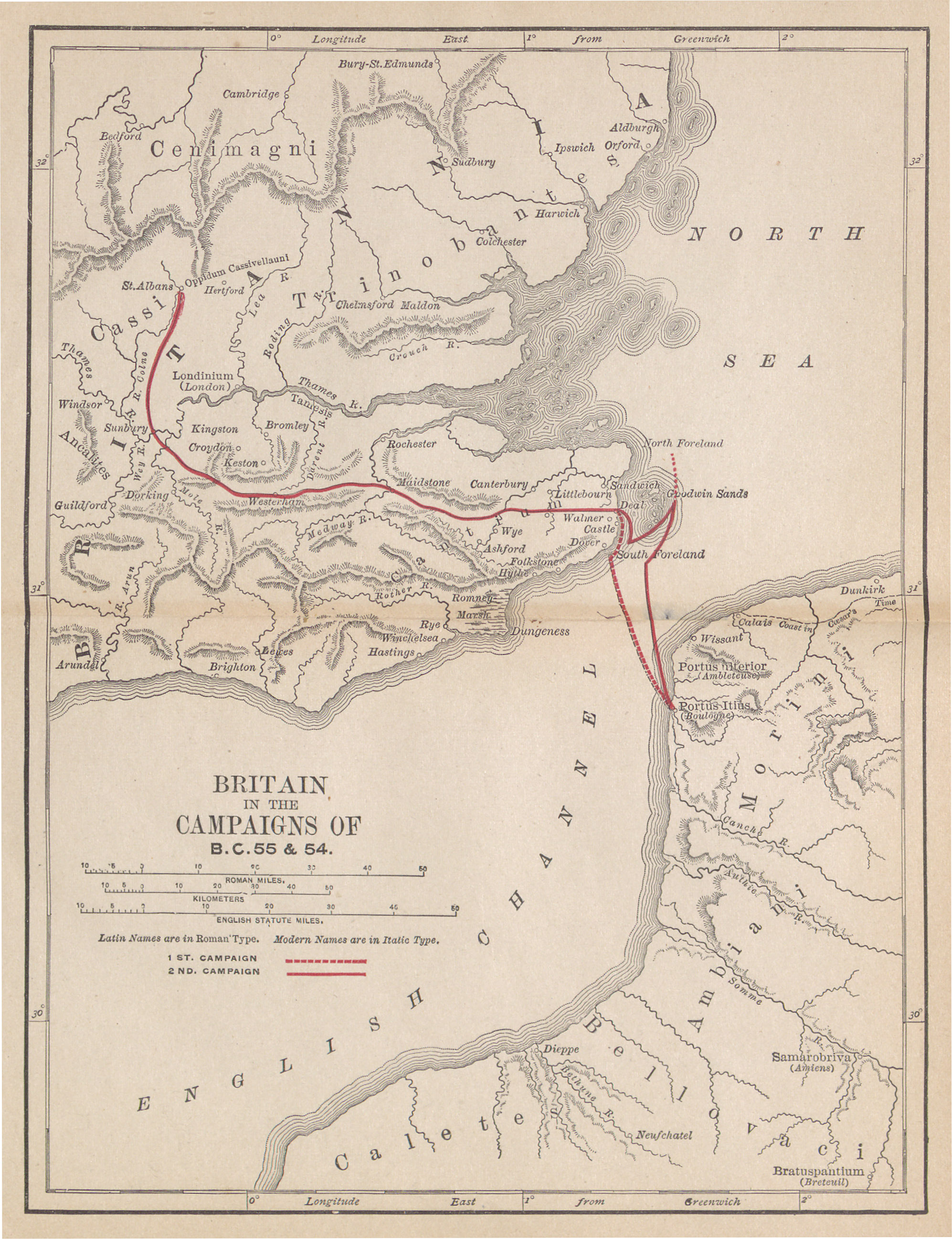 카이사르의 브리타니아 여정은 침공보다는 탐험이었다. 그는 7군단과 10군단, 두 개 군단만을 데려갔다. 그의 기병 보조군은 여러 번의 시도에도 불구하고 횡단할 수 없었다. 카이사르는 시즌이 후반으로 넘어가는 시점에 몹시 서두르며 8월 23일 자정이 훨씬 지난 뒤 약 80 척의 수송선과 알 수 없는 수의 전함으로 구성된 함대와 함께 모리니족의 이름 없는 항구(칼레 부근의 불로뉴쉬르메르로 추정)에서 출발했다. 처음에는 켄트 지방 어딘가에 상륙할 계획이었지만 브리타니아인이 그를 기다리고 있었다. 그는 해안을 따라 이동하여 페그 웰 만(현대 고고학적 발견에서 알 수 있듯이)에 상륙했지만 브리타니아군은 로마 함대와 보조를 맞추며 기병과 전차를 포함한 인상적인 부대를 배치했다. 브리타니아 탐험은 악천후로 그들의 함대 대부분이 파괴되고 브리타니아군의 대규모 전차의 생소한 광경은 군대 사이에 혼란을 일으키면서 거의 패배로 몰아넣었다. 군단 병들은 해변으로 가기를 주저했다. 결국 10군단의 기수가 배에서 뛰어내려 해안으로 나아갔다. 전투에서 군단 기를 쓰러지게 하는 것은 가장 큰 굴욕이었기에 병사들은 기수를 보호하기 위해 하선했다. 약간의 지연 후 마침내 전선이 형성되었고 브리타니아군은 철수했다. 로마 기병대가 오지 않았기 때문에 카이사르는 브리타니아군을 추격할 수 없었다. 로마군의 운은 나아지지 않았고 로마의 보급 부대는 기습당했다. 브리타니아군은 이것을 로마군의 약점의 표시로 여기고 그들을 공격하기 위해 큰 세력을 모았다. 짧은 전투가 계속되었지만 카이사르는 로마군이 승리했음을 나타내는 것 이상의 세부 사항을 언급하지 않았다. 다시 도망가는 브리타니아군을 추격할 기병의 부족은 결정적인 승리를 막았다. 캠페인 시즌이 거의 끝났고 군단은 켄트 해안에서 겨울을 보낼 조건이 안 되었다. 카이사르는 해협을 건너 물러났다.