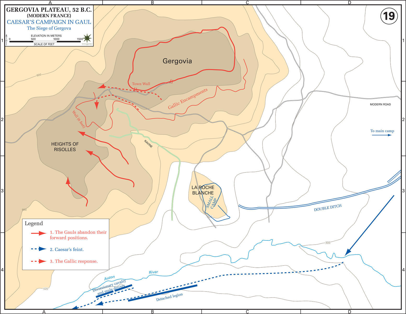 베르킨게토릭스는 이제 자신이 지키고 싶어 했던 자신의 부족의 수도인 게르고비아로 물러났다. 날씨가 따뜻해지자 카이사르가 도착했고 마침내 사료가 이용 가능해지면서 보급 문제가 다소 완화되었다. 평소와 같이 카이사르는 즉시 로마군을 위한 요새 건설에 착수했다. 그는 오피둠에 더 가까운 영토를 점령했다. 이어진 게르고비아 전투에서 일어난 일은 다소 불분명하다. 카이사르는 부하들에게 오피둠 근처의 언덕을 점령하라고 명령했고 그 후 퇴각하는 소리를 냈다고 주장했다. 그러나 그러한 퇴각은 일어나지 않았고 로마군은 정착지를 직접 공격했다. 역사가 길리버는 실제로 카이사르의 퇴각 소리가 들리지 않았을 가능성이 높으며 정착지에 대한 그의 계획이었을 가능성이 있다고 생각했다. 카이사르의 모호한 주장은 압도적으로 계속되는 실패로부터 거리를 두기 위한 것이었을 것이다. 수적으로 많았던 로마군의 공격은 분명한 패배로 끝났다. 카이사르는 46명의 백부장을 포함하여 700명이 사망했다고 주장했다(사상자 수가 실제보다 훨씬 적을 가능성이 있다). 카이사르는 포위 공격에서 물러났고 베르킨게토릭스의 승리는 많은 새로운 갈리아 부족을 그의 대의에 합류하도록 끌어들였다. 그들의 손실에도 불구하고 로마인은 여전히 수많은 게르만 부족들을 전투 후 그들에게 합류하도록 설득했다.