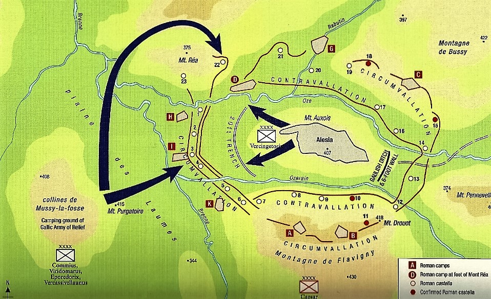 갈리아인은 로마군의 요새에서 약점을 발견했다. 언덕의 북쪽은 로마군이 요새를 지을 수 없었고 가파르고 불리한 땅에 두 군단이 있는 캠프를 배치했다. 갈리아 원군은 6만 명을 선발해 베르킨게토릭스의 가까운 친척인 베르카시벨라우누스를 임명하여 그 지점에서 공격을 이끌게 했다. 그들은 동이 트기 전에 진군하여 정오에 공격을 시작했다. 베르킨게토릭스는 부대를 내보내 약해 보이는 내부 요새의 모든 부분을 공격했다. 카이사르는 약한 지역의 방어를 지원하기 위해 라비에누스를 6개 기병 코호트와 함께 보냈다. 그는 Brutus를 6개 기병 코호트와 함께 보냈고 내부 요새를 방어하기 위한 추가 병력으로 카이우스 파비우스를 7개의 기병 코호트와 함께 배치했다. 마침내 기병대가 합류했고 공격을 물리쳤다. 카이사르는 라비에누스의 지원을 위해 4개의 코호트를 선발했고 기병의 일부는 그를 따르고 일부는 외부 요새 밖으로 나가 갈리아 원군을 후방에서 공격하도록 명령했다. 라비에누스는 붕괴 직전에 있었고 카이사르의 지시에 따라 지원 부대가 오고 있다는 것을 알렸다. 카이사르는 서둘렀다. 그의 도착은 로마 군대에 활력을 불어넣었고 이들은 "필럼을 옆으로 치우고 검을 들고 교전을 벌였다". 로마 기병대가 갈리아의 후방에서 갑자기 나타났고 로마 군대는 빠르게 전진했으며 갈리아 원군은 달아났다. 그들은 기병대에 의해 요격되어 학살되었다. 포위된 갈리아 원군은 요새에서 물러났다. 그들은 캠프에서 도망쳤고 카이사르는 "병사들이 잦은 증원군으로 인해 지치지 않았다면 하루 종일 뒤쫓아 모든 적의 군대를 격파할 수 있었다"고 말했다. 자정에 로마 기병대가 그들을 추격하기 위해 파견되었다. 많은 사람들이 살해당했고 많은 사람들이 그들이 온 땅으로 도망쳤다.
