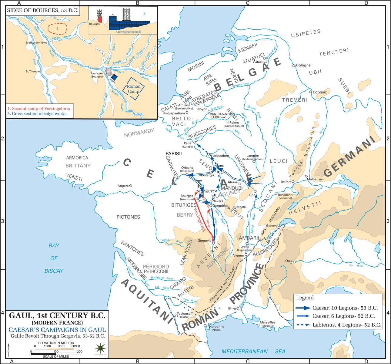 갈리아의 실제적인 우려는 BC 52년에 대두되었고 로마인이 오랫동안 두려워했던 광범위한 반란을 일으켰다. BC 53년의 캠페인은 특히 가혹했으며 갈리아 인들은 로마의 성공을 두려워했다. 이전에는 그들이 하나가 되지 않았기 때문에 쉽게 정복할 수 있었다. 그러나 이것은 카이사르가 갈리아를 로마의 영토로 선언한 BC 53년에 바뀌었다. 이것은 로마인들이 카르누테스족이 지키던 갈리아의 성지를 파괴할 것을 두려워했던 갈리아 인들에게 엄청난 관심의 대상이었다. 매년 드루이드들은 갈리아의 중심지로 간주되는 땅인 그곳에서 만나 부족들 사이를 중재했다. 로마인의 성지에 대한 위협은 마침내 갈리아를 통합시킨 사안이었다. 겨울 동안 카리스마 있는 아르베르니족인 베르킨게토릭스는 갈리아의 대연정을 결집했다.