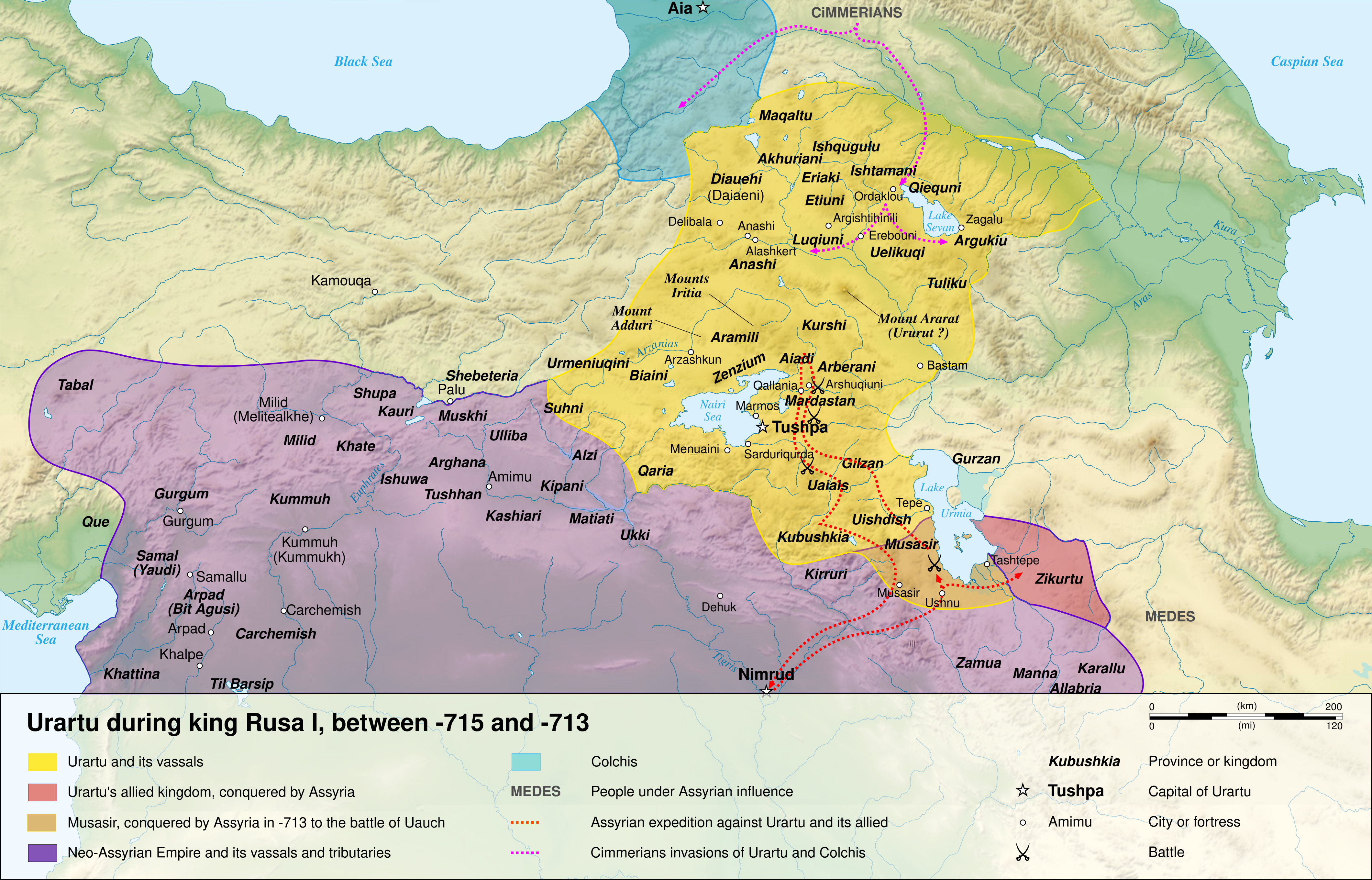 킴메르인은 이후 BC 696-695년에 프리기아를 정복한 것으로 기록되었으며 프리기아 왕 미다스가 포로로 잡히기보다 독을 취하도록 유도했다. BC 679년 아시리아의 에사르하돈(BC 681-669년 경 통치) 치세에 그들은 새로운 지도자 테우시파 아래 아시리아 식민지였던 킬리키아와 타발을 공격했다. 에사르하돈은 후부시나(후피스타) 근처에서 킴메르인을 물리쳤고 또한 그의 후계자 아슈르바니팔의 손에 그들은 패배했다.