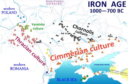 헤로도토스에 따르면 킴메르인는 BC 8-7세기에 코카서스와 흑해 북쪽 지역(즉, 현재 우크라이나와 러시아)에 거주했지만 이 지역의 특정 고고학 문화로는 확인되지 않았다.
