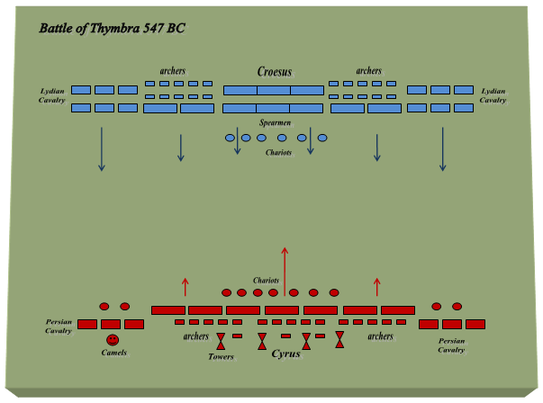 양군의 측면에는 기병을, 중앙 전방에는 전차를 배치했다. 크로이소스는 이집트 창병을 배치했다. 페르시아 군 좌측에는 (스마일 표시) 비밀 무기인 낙타병을 배치했다. 낙타병은 리디아 기병을 2차로 공격했다. 리디아 군은 측면 기병대가 중앙에서 느리게 움직이는 창병보다 빠르게 전진했다. 키루스는 리디아 군의 대열이 자신의 군대보다 더 길게 늘어선 것을 관찰했다. 그는 중앙 병력을 전진시키고 측면은 순차적으로 전진하도록 지시했다. 키루스는 불사 부대를 포함한 정예 부대를 측면에 배치했다.