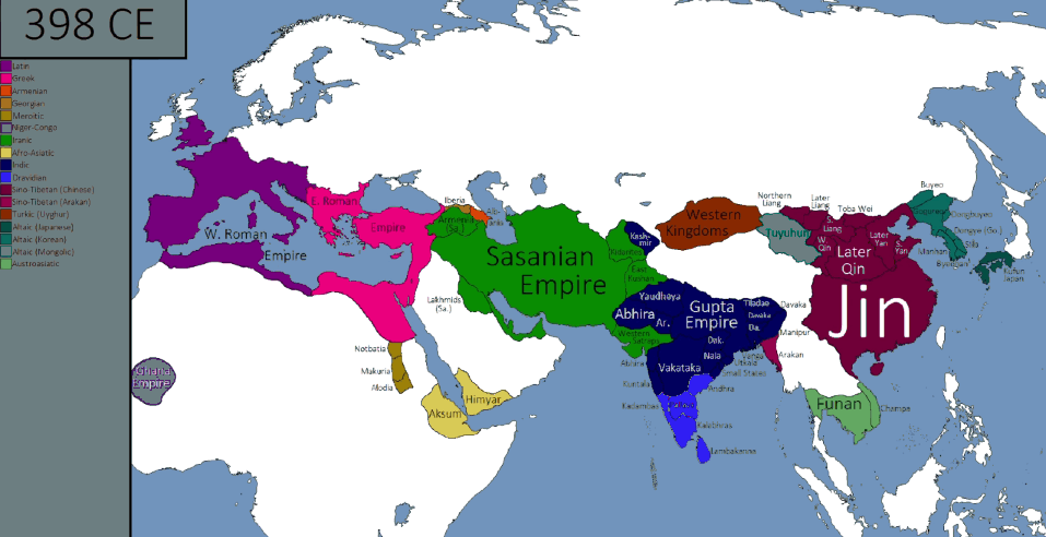 로마 제국은 동·서로 분리되었으며 서로마 제국은 게르만 민족의 침입으로 인해 영토가 줄어들고 있었다. 당시 제국의 북방에는 훈족의 강세가 두드러졌으며 동로마 제국은 사산조 페르시아와 대립하고 있었다. 북인도는 힌두계 굽타 제국 시대로 문화와 예술이 꽃피운 인도의 황금기였다. 몽골 지역을 포함한 동아시아 북부에는 유연이 지배했으며 중국은 북방에서 이주해온 사람들이 세운 오호 십육국 시대를 지나 남북조 시대로 접어들었다. 한국은 사국시대로 그중 고구려는 광개토대왕과 장수왕 시대를 맞아 전성기를 누렸다.