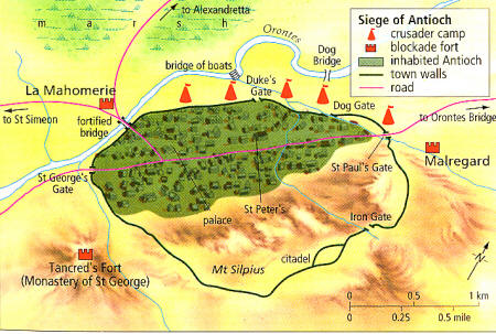 1097년의 안티오키아는 오론테스 계곡의 비탈에 누워 9 km²(3.5 평방마일)을 덮었고 400개의 탑이 있는 성벽으로 둘러싸여 있었다. 강은 도시의 북쪽 벽을 따라 흐르다가 북서쪽에서 안티오키아로 들어가 도시의 북쪽 절반을 통해 동쪽으로 빠져나갔다. 요새가 돌출되어 있는 실피우스 산은 안티오키아의 가장 높은 지점으로 계곡 바닥에서 약 300 미터(1,000 피트) 높이까지 솟아 있었다. 여섯 개의 성문이 있었는데, 북쪽 성벽을 따라 세 개, 남쪽, 동쪽, 서쪽 각각에 하나씩 있었다.