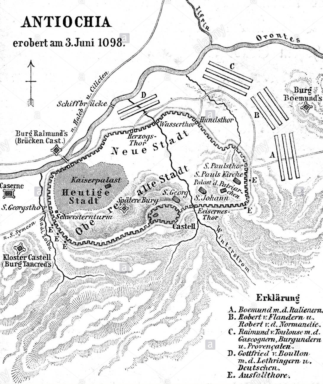 1097년 10월 20일 십자군은 안티오키아 외곽에서 19 km(12 마일) 떨어진 오론테스 강에 있는 철교로 알려진 요새화 된 도하 지점에 도달했다. 플랑드르 백작 로베르 2세와 퓌앙부레의 가톨릭 주교인 르퓌의 아데마르가 다리를 건너며 진격하는 길을 열었다. 타란토의 보에몽은 10월 21일 강 남쪽 둑을 따라 선봉에 올라 안티오키아로 향했고 십자군은 도시의 북쪽 성벽 밖에 자리를 잡았다. 십자군들은 몇 개의 그룹으로 나뉘었다. 보에몽은 성 바오로 성문 밖에서 진을 쳤고, 바로 서쪽으로 베르망두아 백작 위그 1세, 노르망디 공작 로베르, 플랑드르 백작 로베르 2세, 그리고 블루아 백작 스테판 2세가 있었다. 툴루즈 백작 레몽 4세와 르퓌의 아데마르는 오론테스가 안티오키아의 성벽을 관통하는 도그(Dog) 문의 양쪽에 자리를 잡았다. 고드프루아 드 부용은 듀크 문 서쪽에 위치해 있었다. 안티오키아의 서쪽 성벽 바깥에 있는 오론테스 강을 가로지르는 다리는 이 지점에서 야기 시얀의 통제 하에 있었다. 그 후 9개월간의 포위전은 "이 시대의 가장 큰 공방전 중 하나"로 묘사되었다.