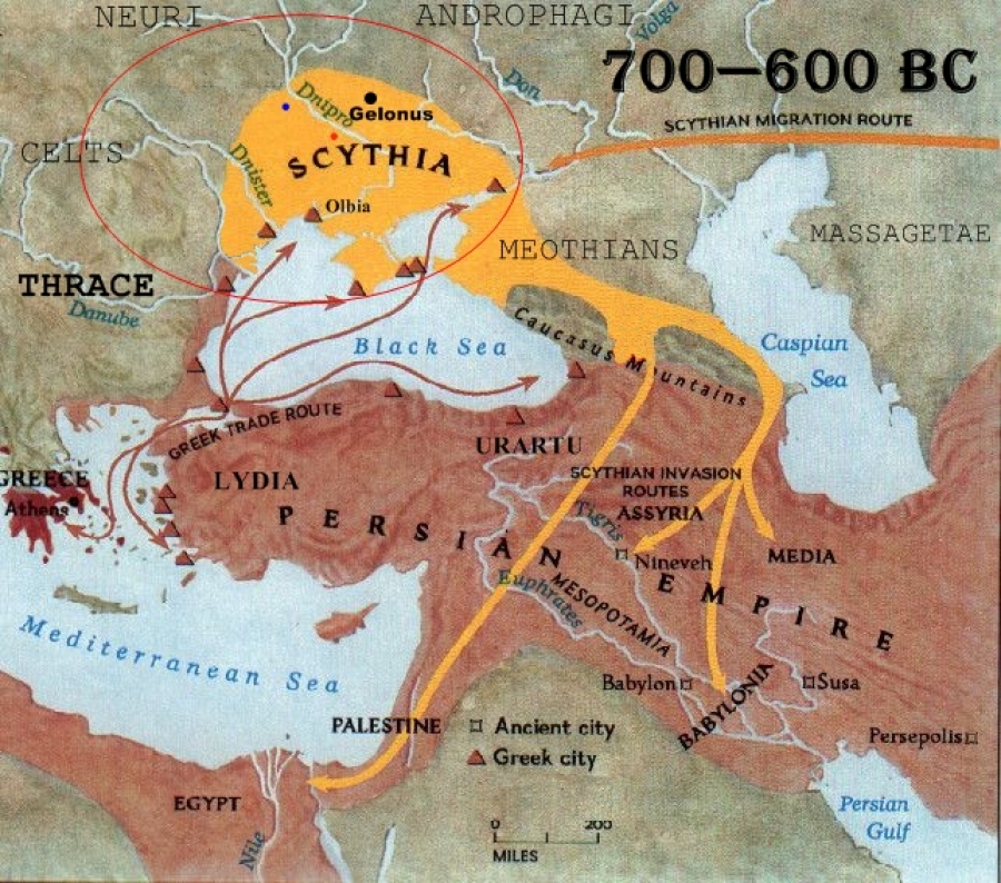 처음부터 스키타이족은 흑해에서 40일간 항해한 것으로 알려진 드니프로 강 상류 지역인 게로스에 그들의 왕을 묻었다. 이곳은 아마도 가장 큰 고대 스키타이 고분이 발견된 바실키프(지도의 파란색 점) 근처의 키이우 주 지역일 것이다.