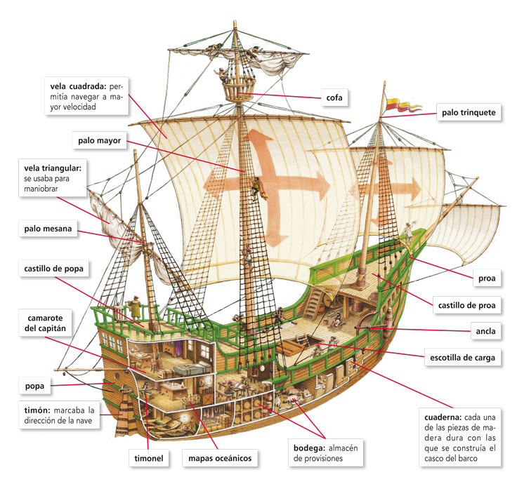 무게가 가볍고 속도도 빨라 선원들에게 큰 도움이 됐다. 초기 캐러벨은 일반적으로 삼각형 돛과 2-3개의 돛대가 있었고, 후기 선박은 네 개의 돛대가 있었다. 15세기의 캐러밸 틸하다와 같은 초기 캐러벨은 평균 길이 12~18 미터(39~59 피트), 평균 용량 50~60 톤, 길이와 폭의 비율은 3.5~1, 좁은 타원형 프레임(나오의 원형 프레임과 달리)은 매우 빠르고 기동성이 뛰어났지만 용량은 다소 적었다. 크리스토퍼 콜럼버스가 1492년에 그의 탐험을 시작한 것은 이런 배들이었다. 산타 마리아는 기함 역할을 했던 약 100 톤의 나오였고 핀타와 니냐는 약 15~20m의 작은 캐러밸선으로 6m의 폭과 약 60~75 톤의 용량을 가지고 있었다.
