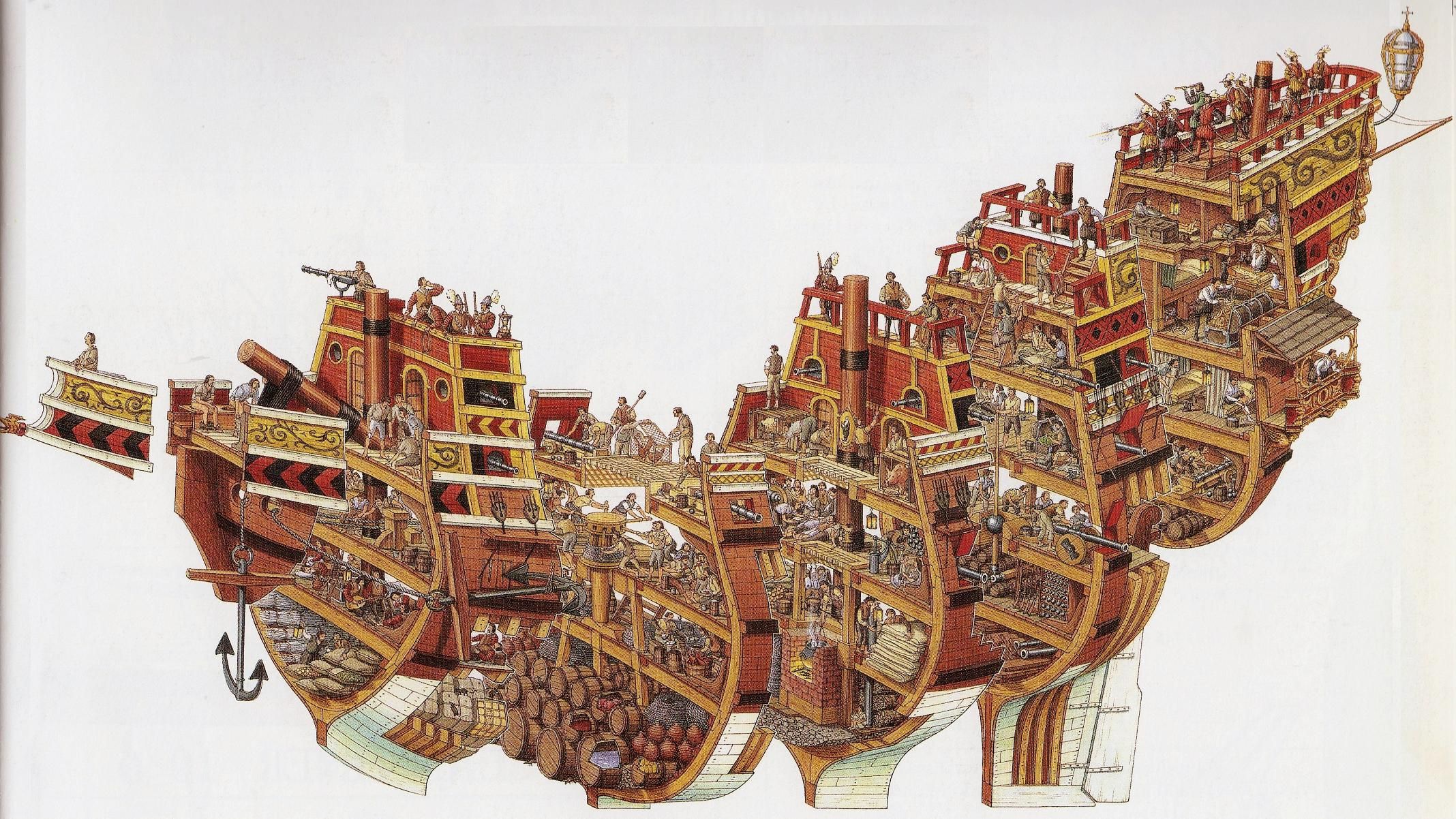 갤리언은 16세기부터 18세기까지 유럽 국가들이 돛의 시대에 최초로 무장 화물선으로 사용했던 대형 다층 범선이었으며, 1600년대 중반의 영국-네덜란드 전쟁까지 군함으로 사용되기 위해 고안된 주요 선박이다. 갤리언은 일반적으로 3개 이상의 돛대와 후미 돛대에 종범장(세로 돛)이 달려 있었고, 앞 돛대와 주 돛대는 가로 돛으로 되었으며 눈에 띄게 사각형으로 솟아오른 선미가 있는 카벨로 제작된 선박이었다.