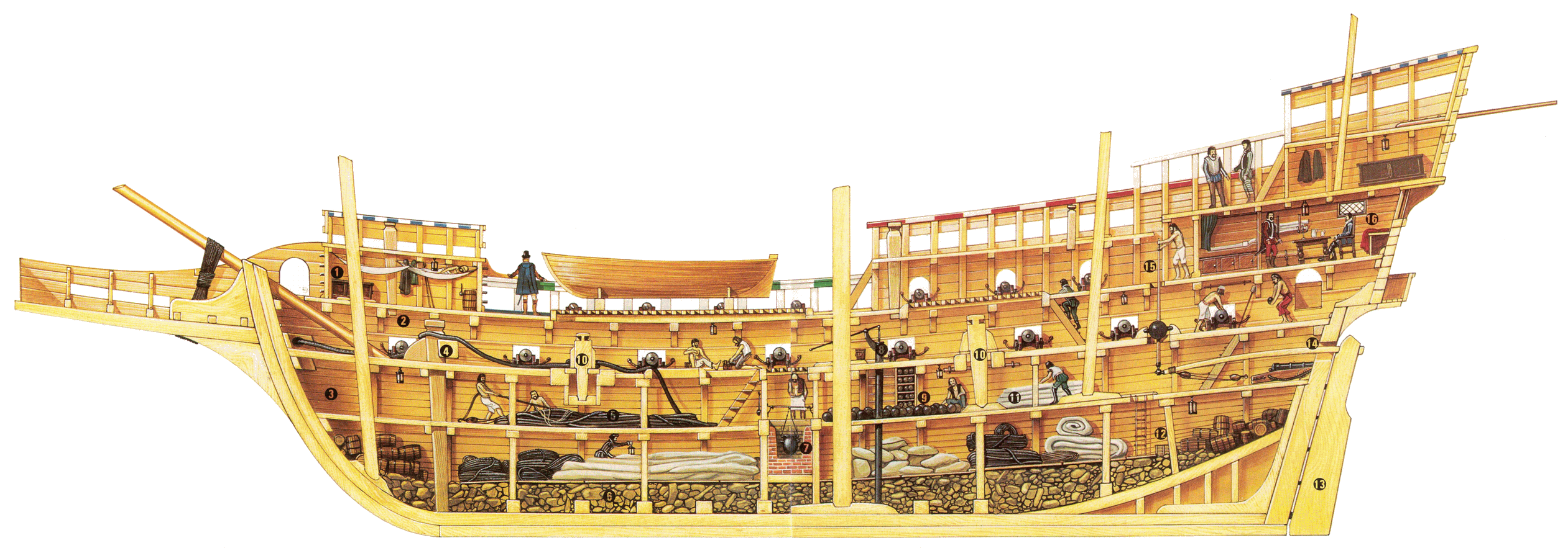 이러한 선박은 19세기 초까지 해상 무역의 중심이 되었으며, 종종 보조 해군 함선으로 사용되기 위해 개량된 선박이 사용되었다. 실제로 신항로 개척 시대의 150년 동안 대부분을 통해 경쟁하는 함대의 주축이었다. 영국-네덜란드 전쟁이 일어나기 전에, 특별히 목적에 맞게 만들어진 3개의 돛대에 가로 돛을 단 전함이 등장했고, 그 후 남은 돛의 시대 동안 해상에서의 전쟁을 지배했다.