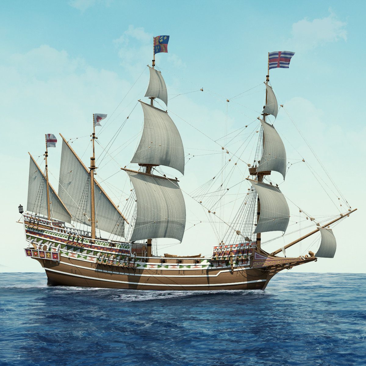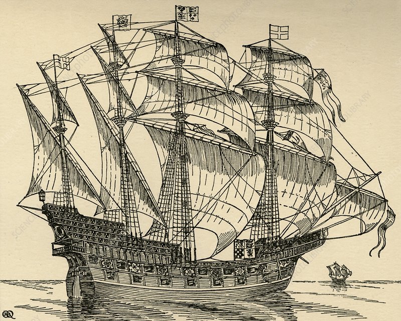 · 엘리자베스 여왕 시대의 가장 큰 갤리언인 '트라이엄프'. 스페인 함대와의 해전에서 마틴 프로비셔 경의 기함