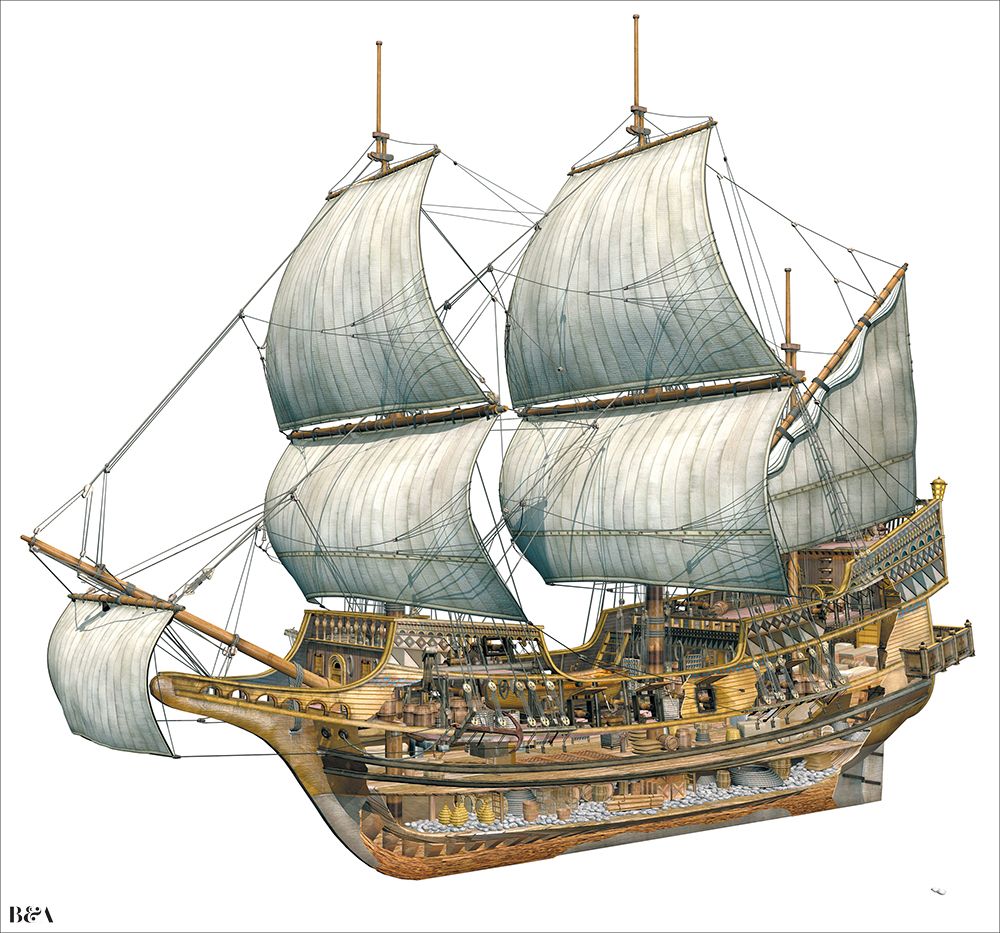 이러한 선박은 19세기 초까지 해상 무역의 중심이 되었으며, 종종 보조 해군 함선으로 사용되기 위해 개량된 선박이 사용되었다. 실제로 신항로 개척 시대의 150년 동안 대부분을 통해 경쟁하는 함대의 주축이었다. 영국-네덜란드 전쟁이 일어나기 전에, 특별히 목적에 맞게 만들어진 3개의 돛대에 가로 돛을 단 전함이 등장했고, 그 후 남은 돛의 시대 동안 해상에서의 전쟁을 지배했다.