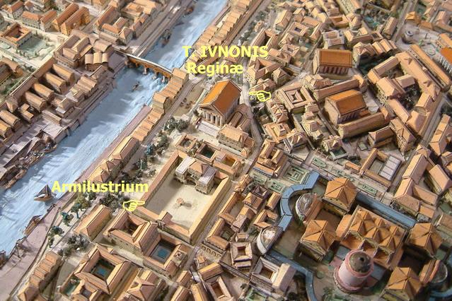 아벤티노의 비탈을 오르면서 프로부스 다리 높이에서 우리는 주목할만한 사원과 주랑 현관을 발견할 수 있다. 유노 퀸 신전은 사진의 거의 중앙에 있는 거대한 사원이다. 유노 퀸 신전 옆에는 아시니우스 폴리오의 구상 덕분에 로마 최초의 공공도서관이 된 리베르타스 신전이 있었다. 사진 왼쪽의 주랑 현관으로 둘러싸인 거대한 광장은 매년 10월 19일(무기 정화 축제일)에 열리는 마르스 신의 축제에 헌정된 아르밀루스트리움일 수 있다. 광장의 중앙에는 마르스에 헌정된 작은 제단이 서있었다. 트라야누스는 사진의 하단에 아르밀루스트리움 근처에 사저를 두고 있었을 것이다.