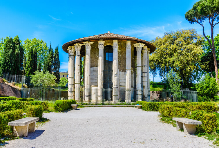 이 경치에서, 사진 중앙의 왼쪽에 BC 6세기에 지어진 다이아나 신전과 측면에 두 개의 거대한 주랑 현관이 있다. 미네르바 신전은 다이애나 신전의 바로 오른쪽에 있다. 사진 아래쪽에는 보르툼누스 신전이 있다.