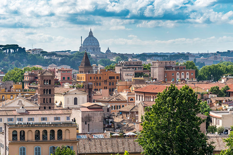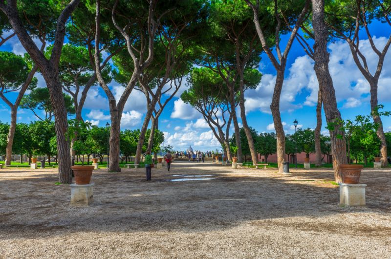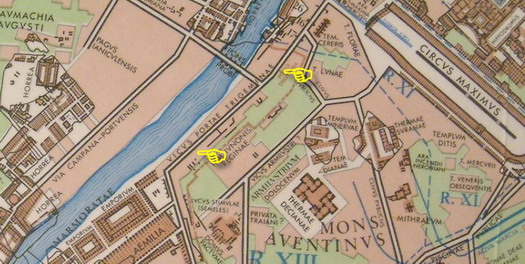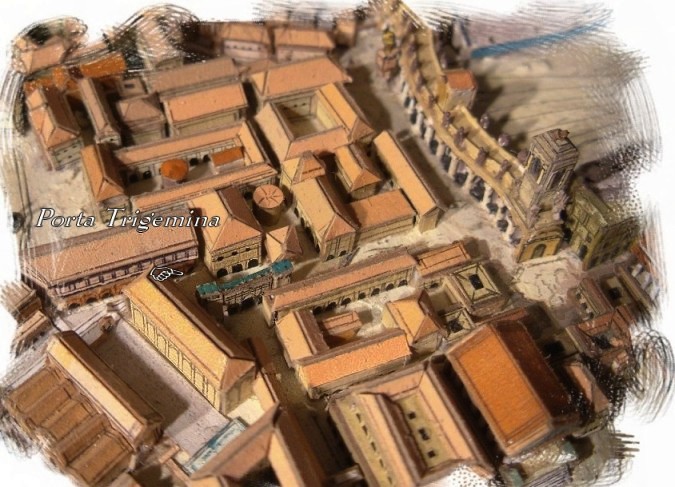 사진 중앙에서, 세르비우스 성벽 시대에 로마로 들어가는 중요한 입구였던 포르타 트리게미나를 짐작할 수 있다.