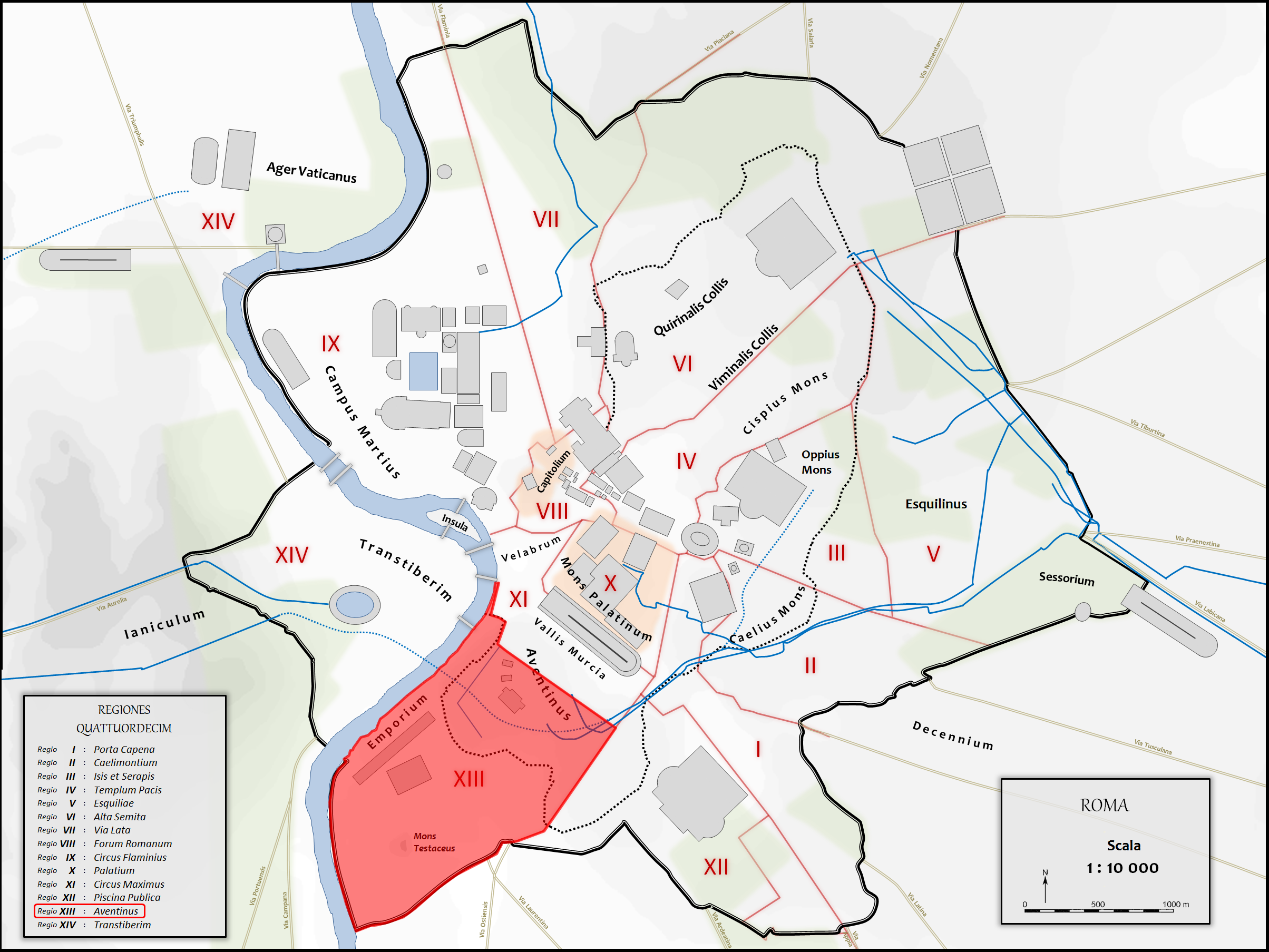 로마의 일곱 언덕 중 하나인 아벤티노 언덕(몬스 아벤티누스), Regio XIII은 높이가 아주 낮았다. 언덕은 실제로 작은 협곡이 공유하는 두 개의 봉우리로 구성되어 있으며 첫 번째 봉우리는 테베레 강에 가깝고 두 번째 봉우리인 소 아벤티노(그리고 피스키나 푸블리카라고 불리는 로마의 Regio XII에 속하는 일부)는 더 남쪽에 있다. 공화국 동안에는 항상 인기 있는 지역이었으며 제국 시대에 더 많은 주거 지역이 되었다. 세르비우스 툴리우스 왕은 라틴인의 연방 성소가 된 다이아나 사원을 지었다. 또 다른 오래된 종교 건물인 미네르바 사원도 있었다. 가장 인상적인 데키우스 목욕탕 외에도 트라야누스 황제의 친구 중 한 명이 사설 목욕탕인 수라 목욕탕을 지었다.