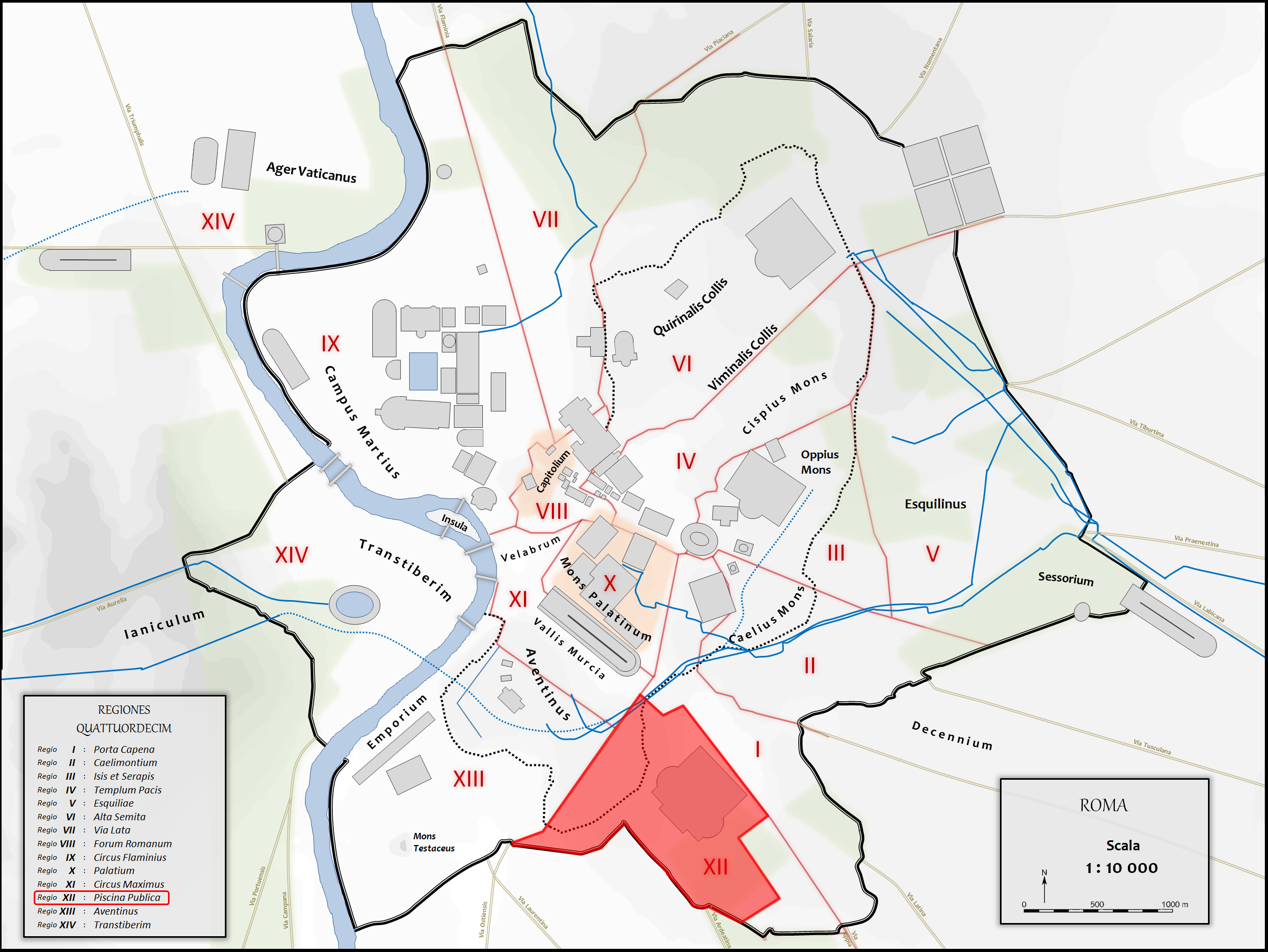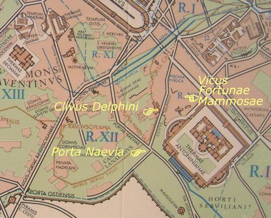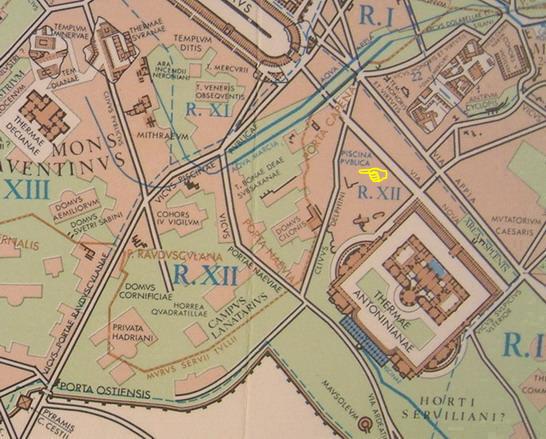 사진 중앙에 카라칼라 목욕탕과 아피아와 마르키아 수도교 사이에 아우구스투스의 행정 구역 XII가 펼쳐져 있다. 이 지역은 피스키나 푸블리카라고 불리기도 했는데, 과거에 로마의 젊은이들이 수영을 배우던 공공 수영장을 발견할 수 있었기 때문이다. 이곳은 아벤티노 기슭에 있는 거대한 저수지로, 사람들과 말을 씻는 물을 담는 장소로도 이용되었다. 그 장소에 대한 식별은 BC 215년까지 올라갔다. 시간이 흐르면서 수영장이 사라져도 이름은 남아 있었다. 계획에 따르면 저수지는 Q. 아이아키우스 켄소리누스의 저택이 위치한 곳에 있었어야 했는데, 더 아래에 위치했다. 소 아벤티노의 꼭대기에서 포르타 나이비아를 출발점으로 하여, 노바 가도에 도달하기 위해 지역을 가로질러 내려가는 클리부스 델피니를 따랐다. 비쿠스 포르투나이 맘모사이는 클리부스 델피니의 중심과 노바 가도 사이를 연결했다.