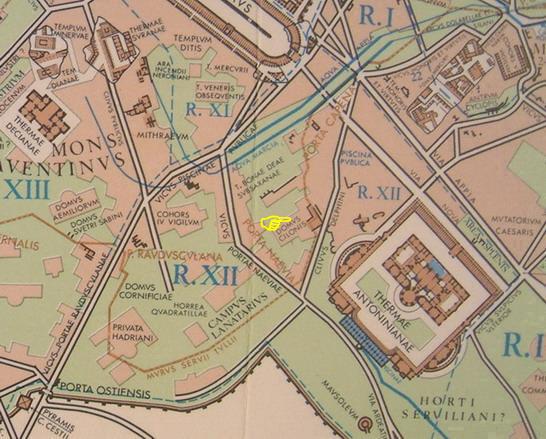 클리부스 델피니를 내려갈 때 언덕 비탈에 세워진 당당한 복합 단지와 정원이 눈길을 끌었다. 오른쪽에는 켈로니아 파비아의 정원과 왼쪽에는 도시의 유명한 프라이펙투스이자 193년과 204년에 집정관이 된 L. 파비우스 킬론(L. 파비우스 킬로)의 궁전이 있다. 그는 셉티미우스 세베루스와 그의 아들 카라칼라의 친구였다. 이 궁전은 셉티미우스 세베루스가 그에게 제공했을지도 모른다.