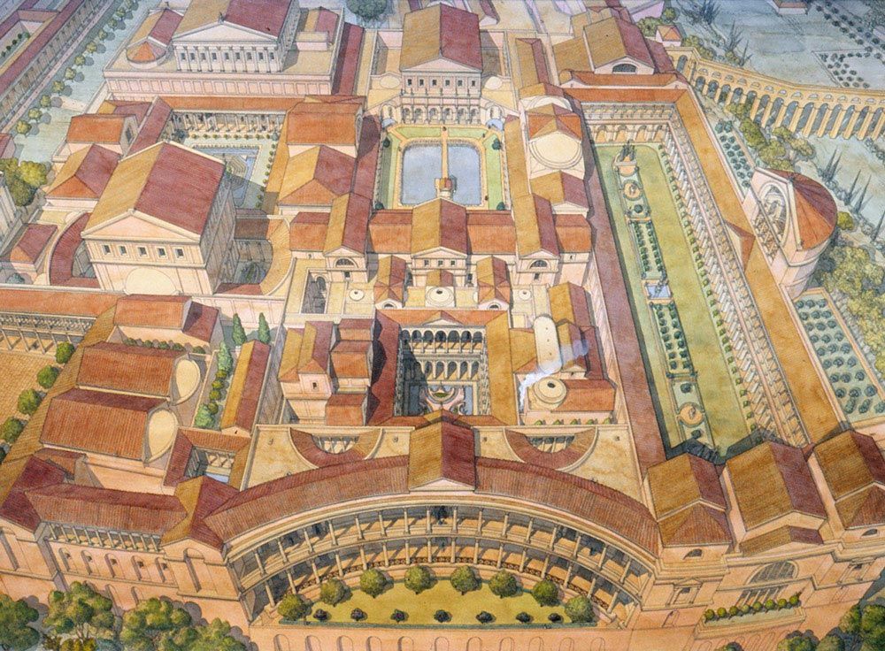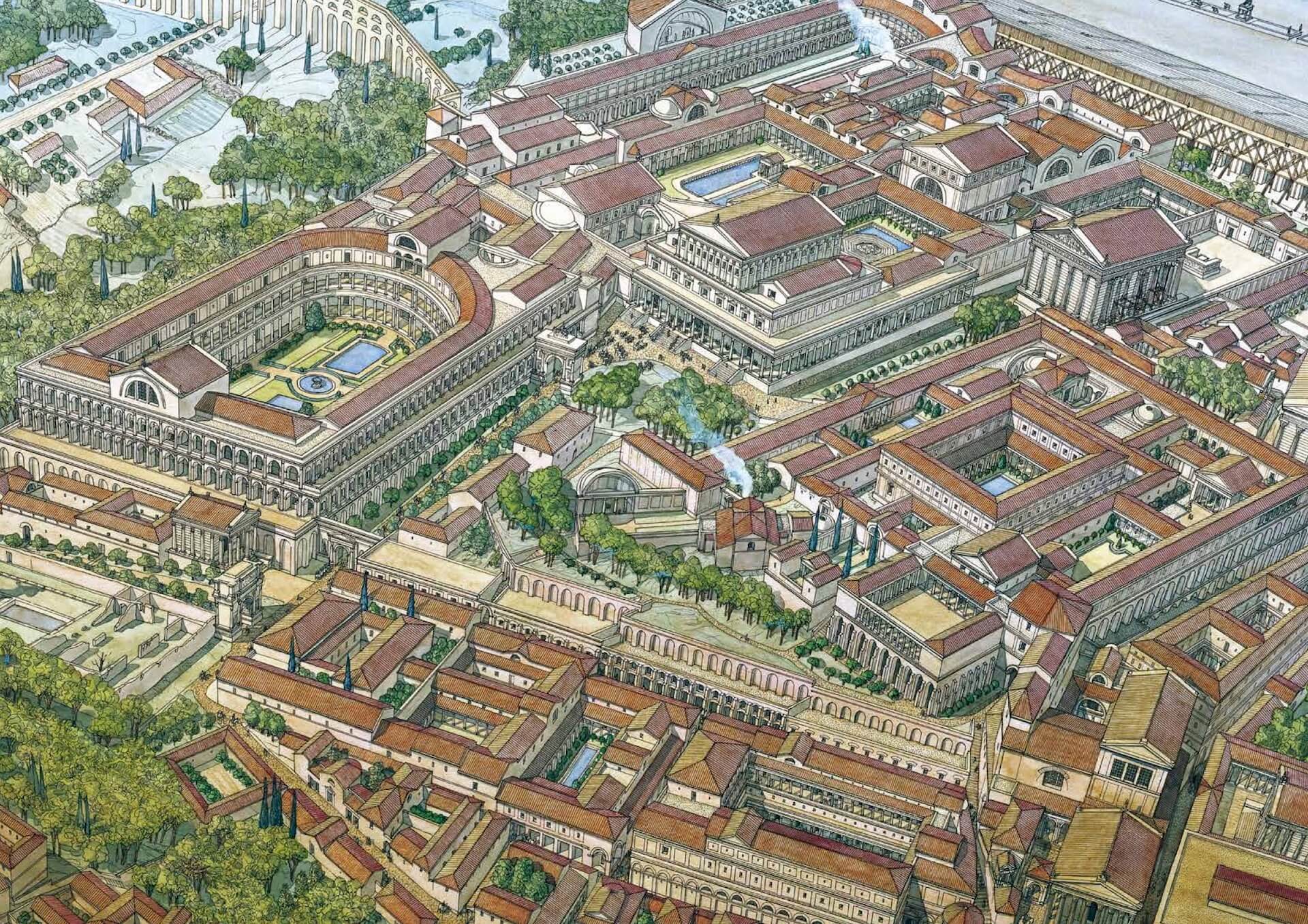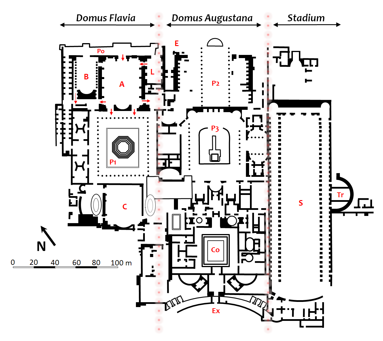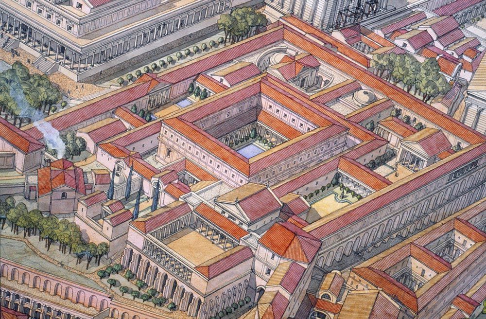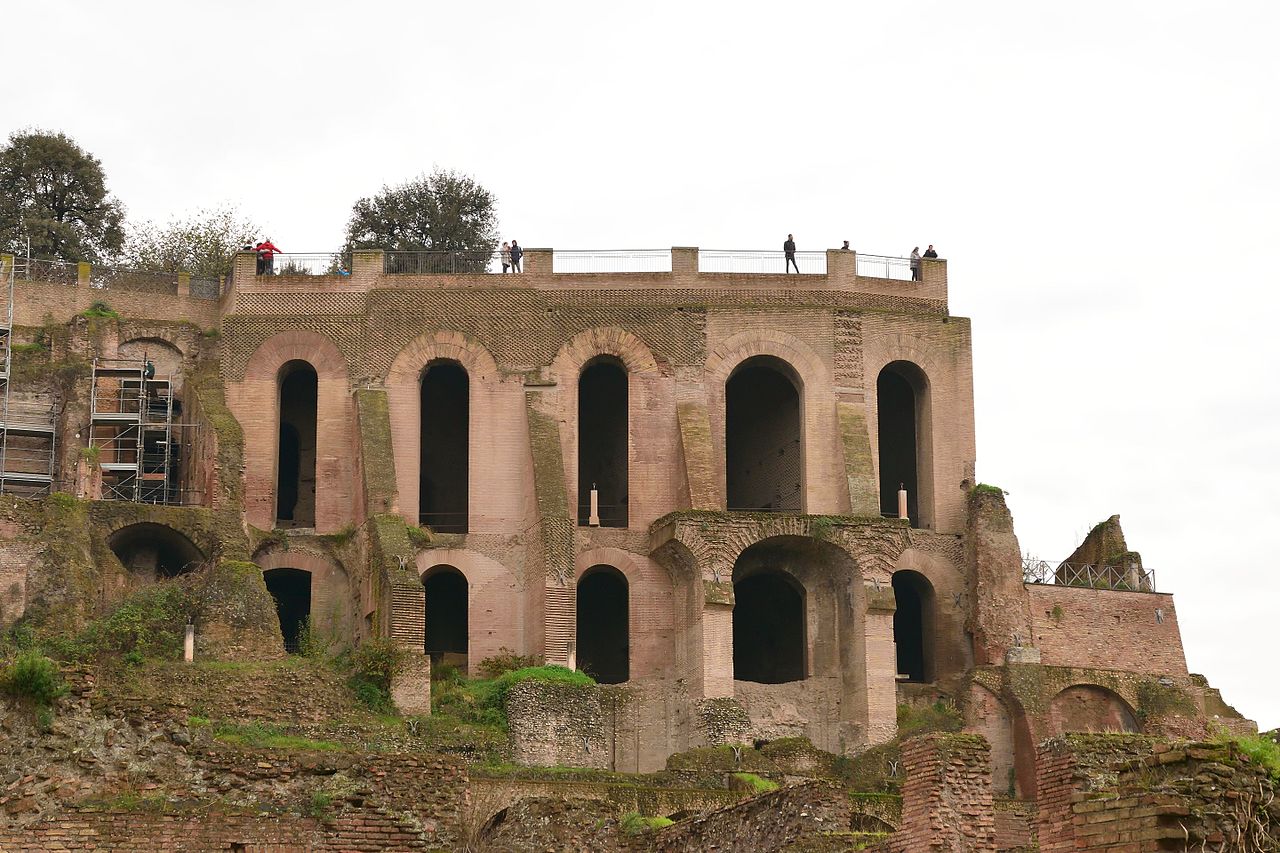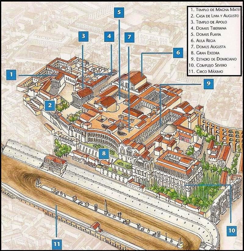 팔라티노 언덕은 공화정 시절 고위층인 키케로, 마르쿠스 안토니우스, 마르쿠스 아그리파, 그리고 훗날 아우구스투스 카이사르인 옥타비아누스를 위한 단순한 주거지역이었다. 제국 지배하에, 그것은 간단히 다음과 같이 나눌 수 있는 광대한 궁전으로 더 부유해졌다. 사진의 왼쪽에는 티베리우스 궁전, 중앙에는 거대한 정사각형 구조를 형성한 도무스 플라비아와 도무스 아우구스타나, 오른쪽 위에는 스타디움과 셉티미우스 세베루스 궁전이 있다. 멀리서 본 이 경관은 팔라티노의 궁전이 거대한 건축물이 되었다는 것을 더 잘 이해할 수 있게 해 주며, 건물들이 서로 붙어있어 건축 전체가 계획된듯한 착각을 불러일으켰다.