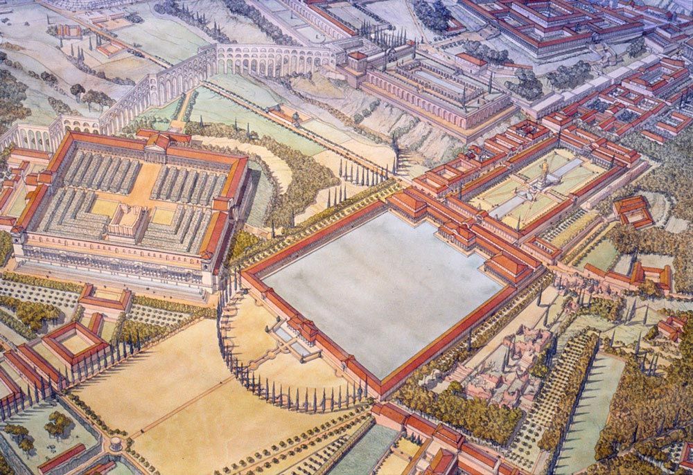 더 가까이에서 본 궁전의 중심부에 있는 도무스 플라비아와 함께 훌륭한 페리스타일(주랑 현관의 일종)과 연못이 보인다. 궁전 옆에는 팔라티노에 지어진 신전들이 있다.