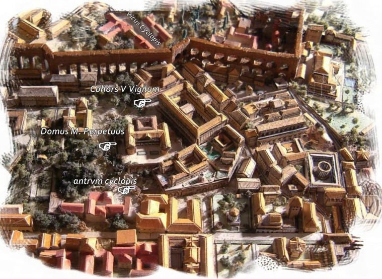 신성한 카모이나이 나무의 남쪽, 비쿠스 키클로피스가 있는 사진 중앙에는 경비대 Vth 코호트의 막사(코호르스 V 빌기룸)가 보인다. 다소 인상적인 멋진 직사각형 모양의 건물이다. 사진 아래쪽에는 막사와 상당히 가까운 198년에 집정관이었던 L. 마리우스 막시무스 페르페투스의 저택이 있다. 이 도무스의 융기된 지형 기슭에는 비쿠스 키클로피스의 이름이 유래된 키클롭스의 덴으로 알려진 틈 또는 구멍이 있었다.