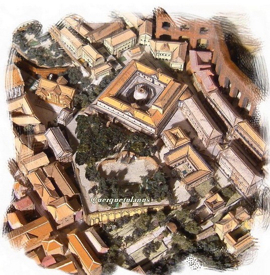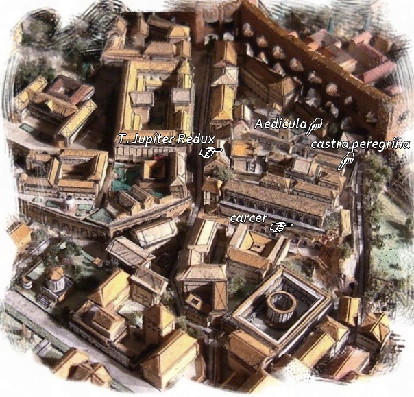 외국계 로마 병사들, 페레그린들(로마인도 라틴인도 아닌 자유민)은 비쿠스 키클로피스의 반대편에 그들의 막사를 가지고 있었다. 카스트라 페레그리나는 감옥과 사원이 있는 복합 건물인 유피테르 레둑스 신전에 속해 있었다. 마지막으로 주랑 현관인 아이디쿨라 게니 카스트로룸은 안뜰이 거대 수도교와 가까웠다.