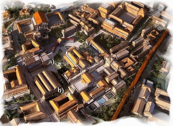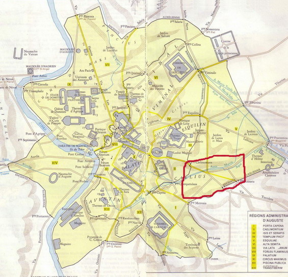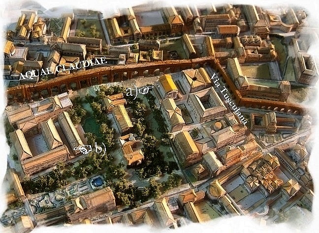 오른쪽 아래에 아쿠아 클라우디아가 카일리우스 동쪽을 지나가고 있다. 거대한 수도교와 에스퀼리노의 경사면 사이에는 두 개의 큰 건물, 즉 테트리쿠스의 저택(a)과 벡틸리안의 저택과 정원(b)이 나타난다. 벡틸리안 궁전은 주로 황제의 호위병을 거느리는 데 사용되었다.