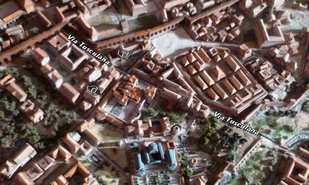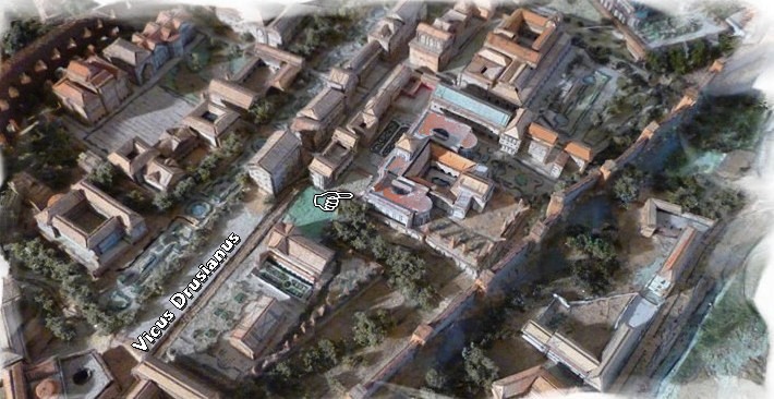 사진의 중앙에는 훨씬 아래쪽에 있는 아피아 가도와 합류하는 비쿠스 드루시아누스가 있다. 옆에는 콘스탄티누스의 아내 파우스타 플라비아 막시마의 거대한 도무스가 있었으며 아우렐리아누스 성벽의 그늘에 있는 광대한 저택이었다. 양옆의 큰 부속건물과 매우 통풍이 잘 되는 내부 궁정, 그리고 훌륭한 정원이 조화로운 토지를 형성했다.