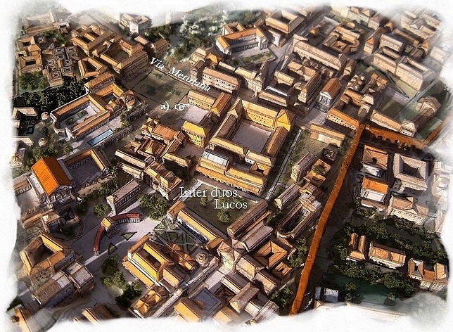 사진 가운데는 인테르 두오스 루코스가 있다. 로마 역사상 거의 언급되지 않은 거리이지만, 테트리쿠스의 저택 위치와 가까웠을 수도 있다. 꼭대기에, 에스퀼리노에 오르는 메룰라나 가도가 있다. 마지막으로, 메룰라나 가도에 그녀에게 바쳐졌을 수도 있는 (트로이 전쟁의) 헬렌의 무덤(a)이 있는 로마의 한 장소를 발견했다.