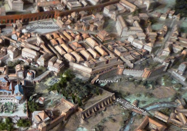 투스쿨라나 가도는 사진 바로 아래 데케니움 계곡을 떠나 카일리우스 동쪽으로 올라간다. 먼저 포스테룰라의 작은 문을 통해 아우렐리아누스 성벽을 지날 수 있었다. 성벽 바로 뒤에, 사진 중앙에 있는 카스트라 노바 에퀴툼 싱굴라리움를 형성하는 건물의 복합물이 주목된다. 이 요새는 황제의 기병 경비대가 사용하던 요새로 셉티미우스 세베루스 시대에 세워졌다. 카스트라 프리오라 이후에 지어졌기 때문에 카스트라 노바(새로운 캠프)로 알려졌다. 사진 위쪽의 아쿠아 클라우디아 옆에 있는 캄푸스 카일리몬타누스(광활한 열린 공간)는 아마도 공화국 집정관이던 아울루스 베르기니우스 트리코스누스 카일리몬타누스를 기리기 위한 것으로 보인다. 마지막으로 캄푸스와 가까운 곳에 마르쿠스 아우렐리우스의 할아버지인 L. 안니우스 베루스의 저택이 있었다.
