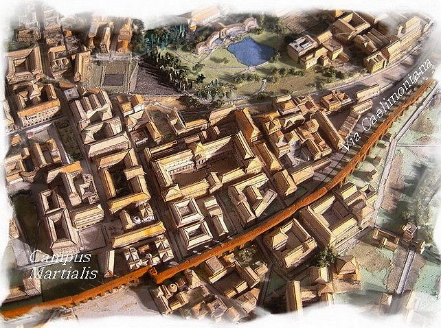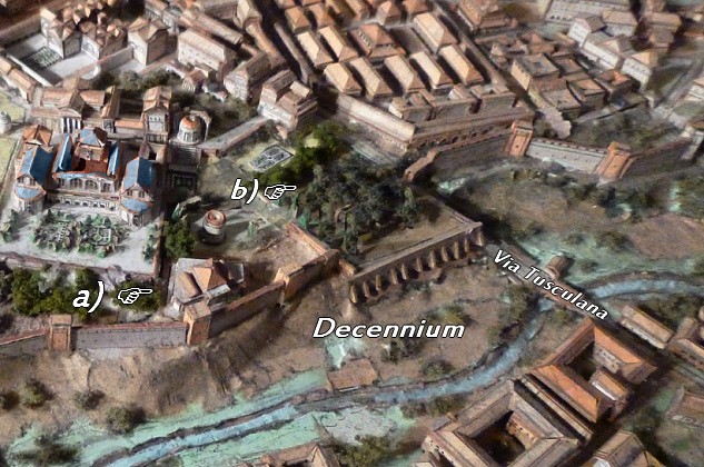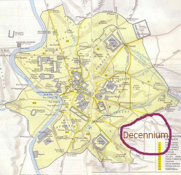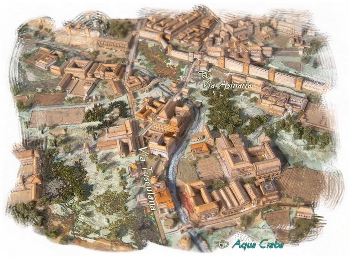 이곳이 데케니움이지만, 동쪽으로 조금 더 향했다. 몇몇 건물들은 아쿠아 크라바의 굴곡을 따르지만, 많은 무덤과 제단도 있었다. 아시나리아 가도와 투스쿨라나 가도는 아쿠아 크라바를 지나 왼쪽 상단의 카일리우스와 오른쪽 상단의 에스퀼리노로 이어졌다.