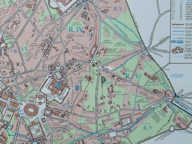 사진 중앙에는 웅장한 정원(호르티)이 있는 에파프로디투스의 저택이 있다. 에파프로디투스는 네로 황제의 해방노예이자 비서였으며 그가 자살하는 것을 도왔다.
