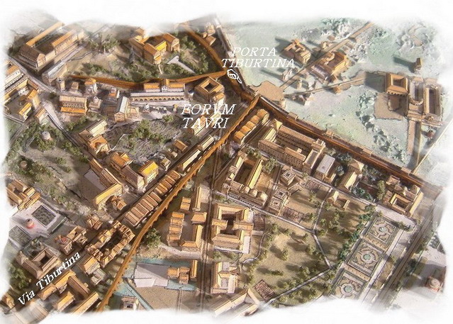 티부르티나 문을 통과하기 전에 여유 공간을 제공한 타우루스 포룸(포룸 타우리). 아우렐리아누스 성벽에 지어진 하나의 아치만 있는 이 문은 로마와 티볼리를 연결하는 도로인 티부르티나 가도로 통했다.