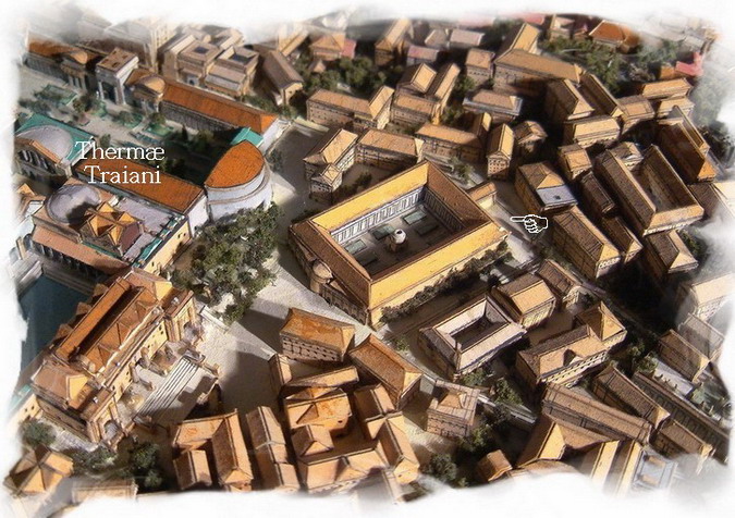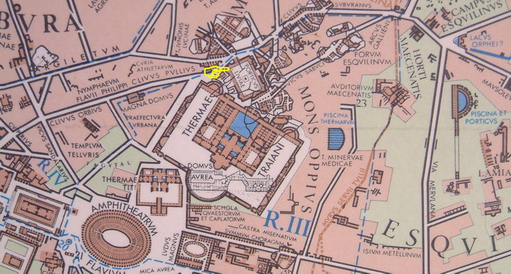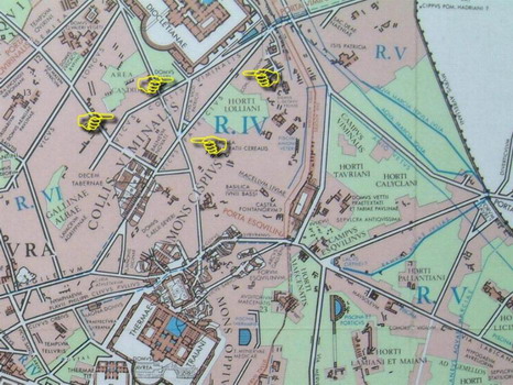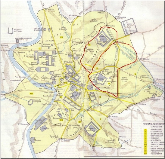 사진은 에스퀼리노의 서쪽, 트라야누스의 대 목욕탕과 Regio V의 동쪽 사이를 나타내고 있다. 455년에 황제였던 페트로니우스 막시무스의 저택(a)에는 정원이 딸린 아름다운 별장과 광활한 내부 궁정, 양쪽의 닫힌 측면 건물로 되어 있었다. 로마의 집정관 두 번과 총독을 지낸 후, 그는 그의 이름을 딴 거대한 페트로니우스 막시무스 포룸(b)을 건설했다. 이집트의 숭배와 연관된 이시스 메텔리누스 신전(c). 마이케나스가 호라티우스에게 티볼리 근처의 별장을 제공했다고 해도, 호라티우스가 시적인 작품으로 인정받으면서 권력의 흐름에 가까운 로마에서 살았던 곳은 이 호화로운 저택(d)이었던 것으로 보인다. 술피키아의 저택(e), 오늘날 작품이 알려진 유일한 로마 시인이다.