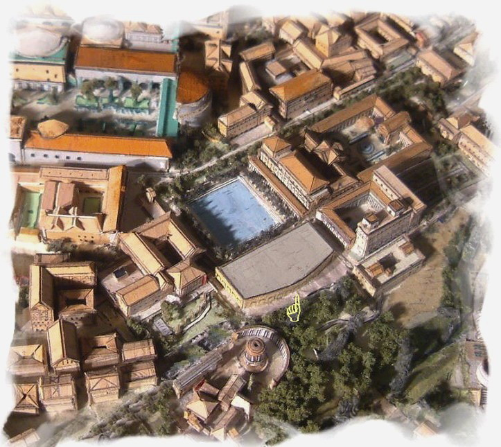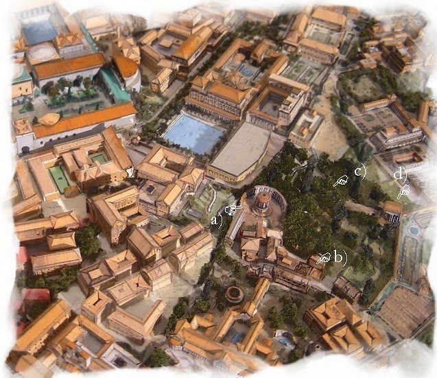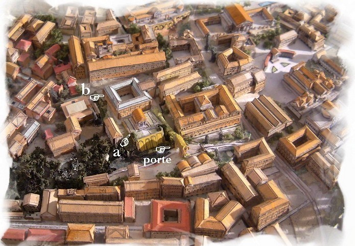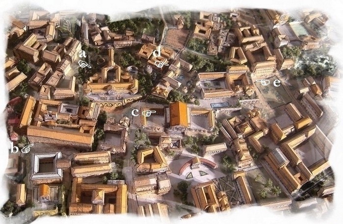 넓은 목욕탕에 가까운 Regio III의 반원형 벽으로 보호되는 둥근 사원(a)과 테라 시길라타의 뛰어난 도자기를 만든 도예가의 가게(b). 에스퀼리노에는 여러 이야기가 전해지는 신성한 숲(c)이 있었다. 숲의 동쪽에 있는 작은 사원(d)은 로마에서 많이 볼 수 있는 것과 같이 실바누스(숲의 신)에게 바쳐진 작은 신전이다.