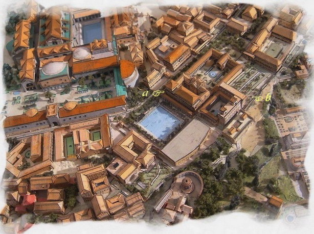 에스퀼리노는 말할것도 없이 마이케나스의 유명한 궁전과 정원뿐만 아니라 역사에 들어간 다른 위대한 도무스를 의미한다. 베르길리우스의 저택(a)은 광대한 내부 정원이 있는 진정한 궁전으로 파사드는 넓고 큰 목욕탕과 연결되었다. 베르실리우스의 저택에 아주 가깝게 지어진 또 다른 도무스가 그 큰 정원과 함께 그림에 나타나며, 아마도 티투스의 사저(b) 일 수 있다.
