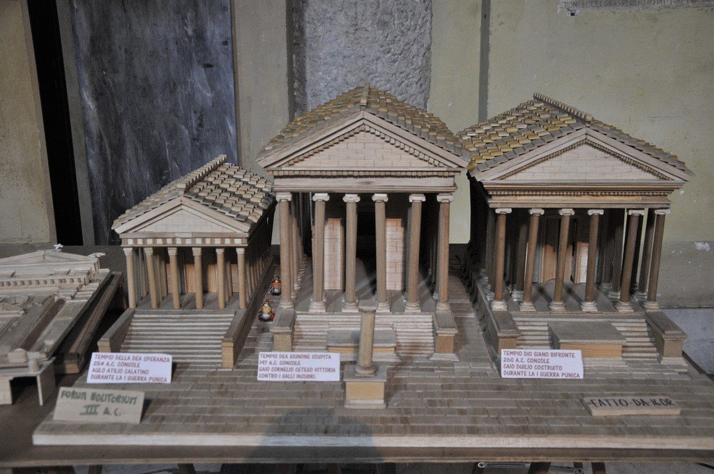 포르타 카르멘타를 통과하자마자 포룸 홀리토리움은 더 넓어지면서 거대한 마르켈루스 극장에 쉽게 접근할 수 있는 넓은 광장을 형성했다. 공화국 시대의 세 사원이 나란히 세워져 포룸에 더욱 엄숙한 모습을 보여주었다. 위쪽의 극장에 거의 반대로 있는 야누스의 신전, 가운데는 유노 소스피타의 신전, 가장 아래쪽은 스페스(희망)의 신전이다.