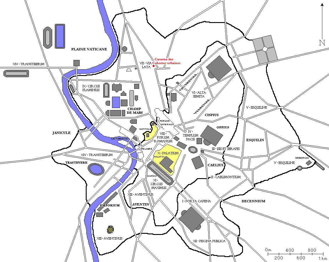 Regio VIIth의 주요 도심 중 하나는 사진 중앙에 있는 우르반 코호르트(경찰) 또는 카스트라 우르바나(경찰)의 막사이다. 우르반 코호르트는 로마 시대의 로마 도시를 위한 경비, 도시 경찰, 그리고 군대라는 세 가지 기능을 가지고 있다. 당시까지는 캄푸스 마르티우스에 있는 막사인 캄푸스 아그리파이 내의 카스트라 프라이토리아에서 지냈던 우르반 코호르트를 위해 270년에서 275년 사이에 아우렐리아누스 황제가 건축했다. 막사는 군사 건물의 구성과 엄숙함을 지녔다.