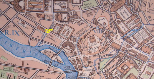 다른 각도에서 본 포르티쿠스 막시마이. 키르쿠스 플라미니우스의 행정 구역인 IXth 지역에서 템플룸 마르티우스인 키르코를 폼페이우스 극장과 상당히 가까운 곳에서 찾을 수 있다. 이전에 "넵투누스 사원"으로 알려진 이 신전은 실제로는 BC 138년에 브루투스 칼라이쿠스 집정관에 의해 지어진 마르스 신전일 것이다. 사진의 거의 중앙에 주랑 현관으로 둘러싸인 흰색 지붕으로 나타난다.