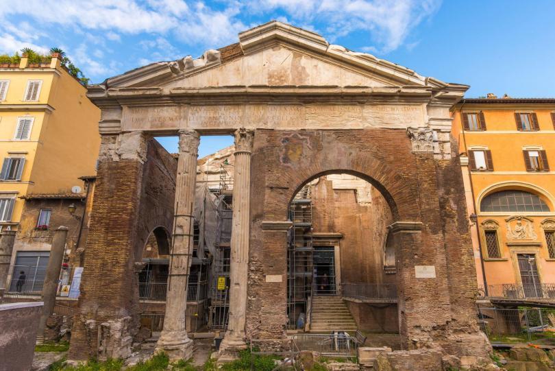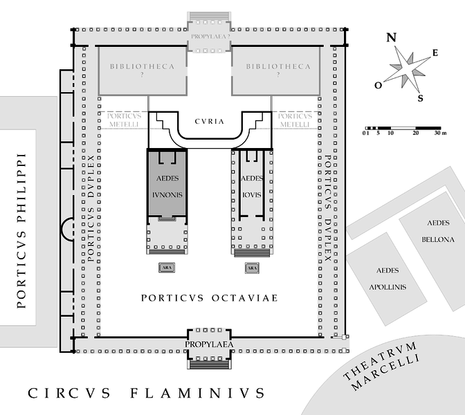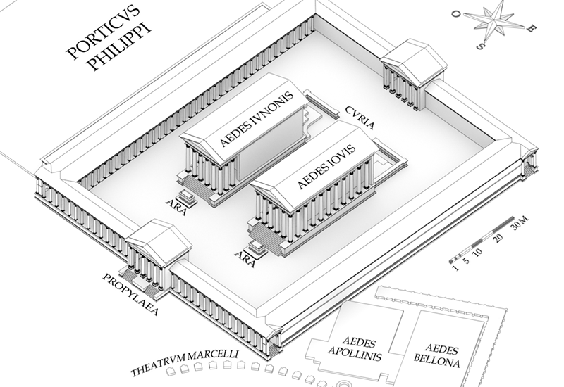 (사진 중앙의) 필리푸스의 포르티코는 BC 29년 루키우스 마르키우스 필리푸스에 의해 세워졌다. 사진에서 헤르쿨레스의 둥근 신전을 볼 수 있다.