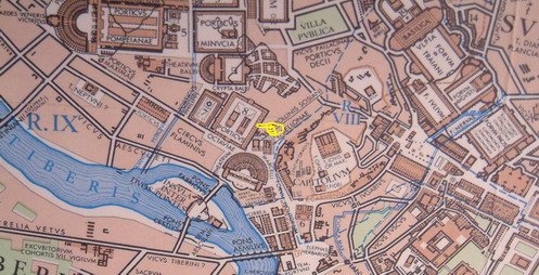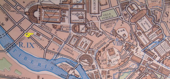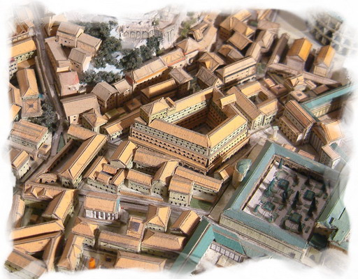 거대한 인술라는 사진 오른쪽 상단에서 볼 수 있는 카피톨리노 기슭에 지어졌다. 전경에는 발부스 극장이 있다.